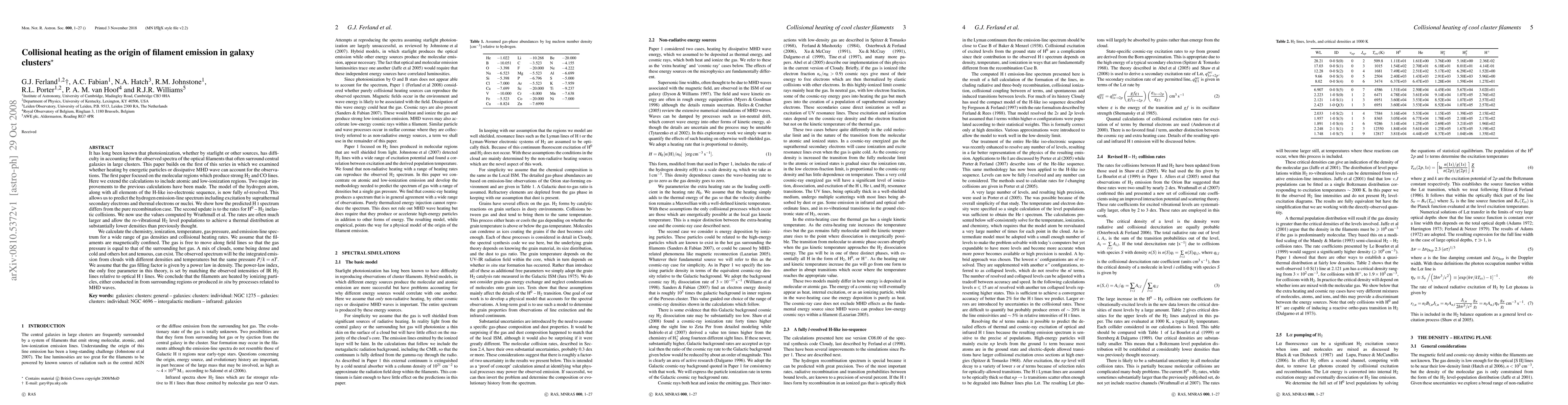 This study explores the origin of filament emission in galaxy clusters, concluding that collisional heating from ionizing particles, either conducted in from surrounding regions or produced in situ by MHD wave processes, is responsible. The research utilizes a nl-resolved model of the hydrogen atom and updated collision rates, demonstrating how the predicted HI spectrum diverges from pure recombination cases. The filaments are assumed to be magnetically confined, with a mix of dense cold and hot tenuous gas clouds, and their observed spectrum is an integrated emission from these diverse clouds.