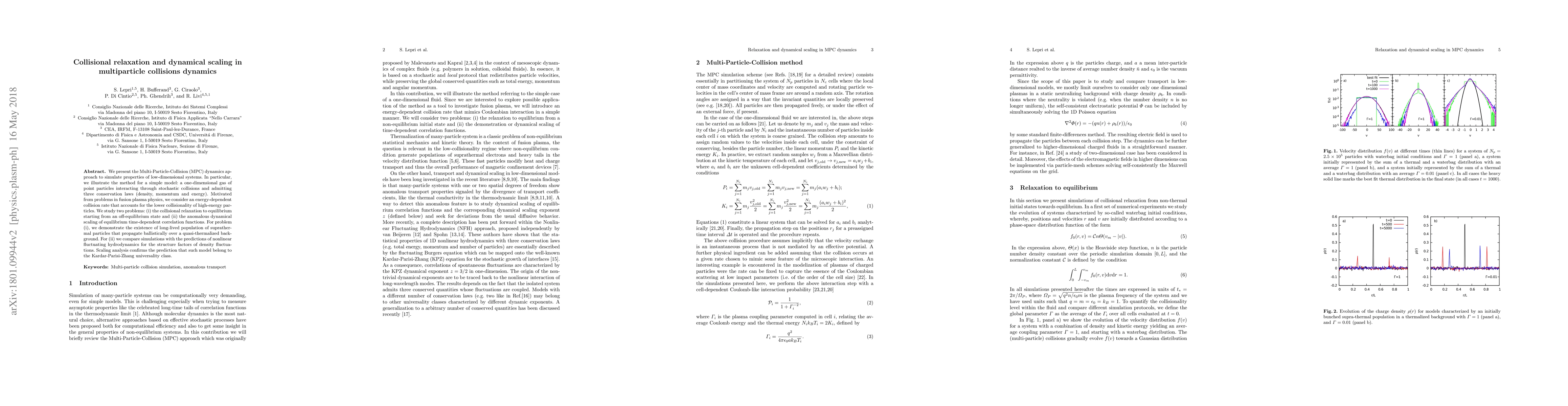 We present the Multi-Particle-Collision (MPC) dynamics approach to simulate properties of low-dimensional systems. In particular, we illustrate the method for a simple model: a one-dimensional gas of point particles interacting through stochastic collisions and admitting three conservation laws (density, momentum and energy). Motivated from problems in fusion plasma physics, we consider an energy-dependent collision rate that accounts for the lower collisionality of high-energy particles. We study two problems: (i) the collisional relaxation to equilibrium starting from an off-equilibrium state and (ii) the anomalous dynamical scaling of equilibrium time-dependent correlation functions. For problem (i), we demonstrate the existence of long-lived population of suprathermal particles that propagate ballistically over a quasi-thermalized background. For (ii) we compare simulations with the predictions of nonlinear fluctuating hydrodynamics for the structure factors of density fluctuations. Scaling analysis confirms the prediction that such model belong to the Kardar-Parisi-Zhang universality class.