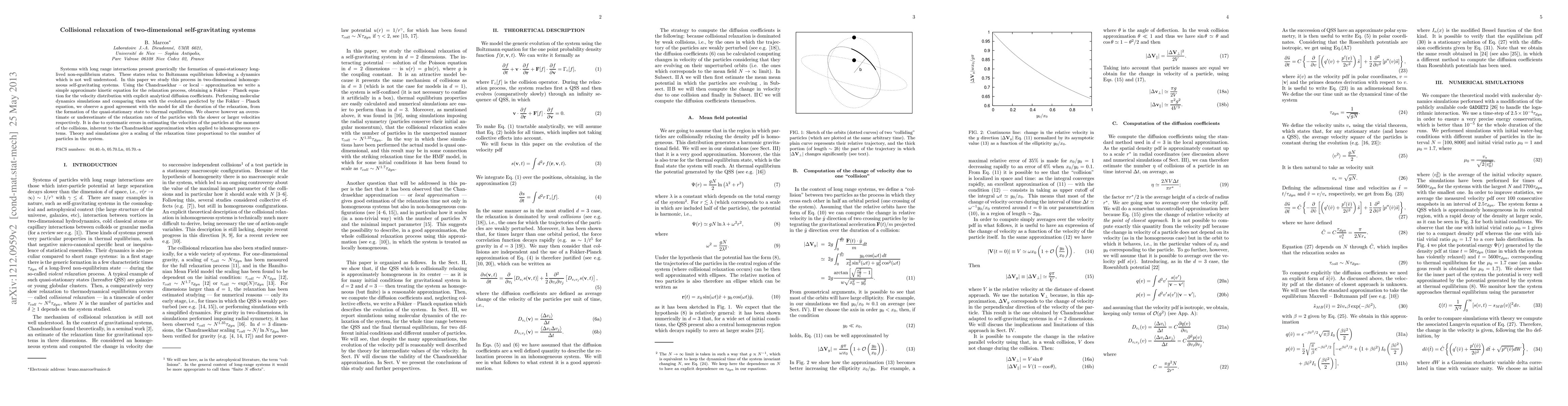 This paper investigates the relaxation process in two-dimensional self-gravitating systems using the Chandrasekhar approximation, deriving a Fokker-Planck equation for the velocity distribution. Simulation results align well with the theoretical model throughout the relaxation period but reveal systematic errors in estimating particle velocities due to the approximation's limitations in inhomogeneous systems.