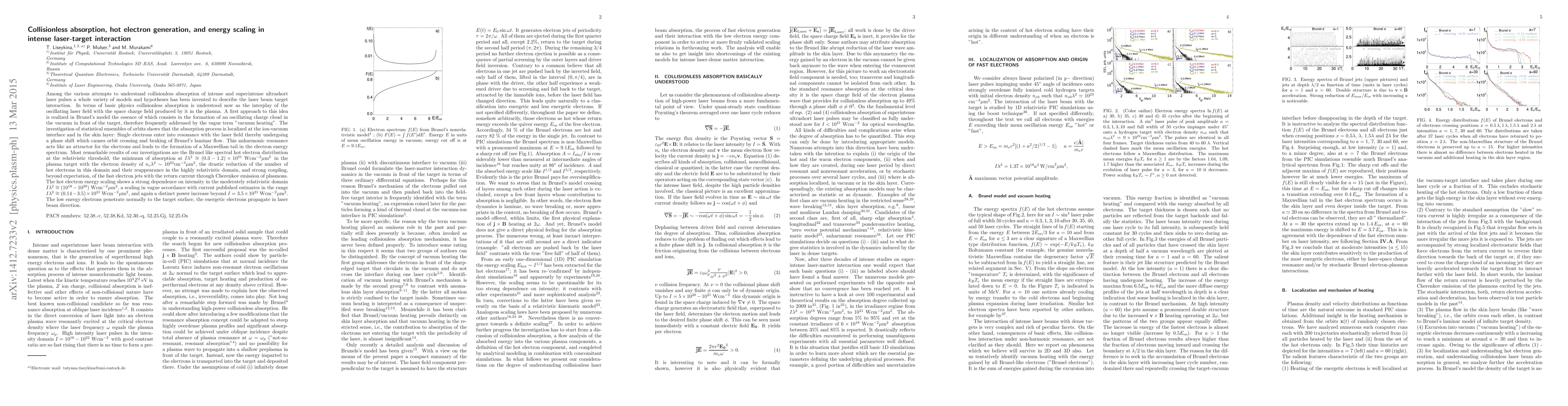 This paper explores collisionless absorption in intense laser-target interactions, revealing Brunel's model's role in generating hot electrons via anharmonic resonance. It finds a minimum absorption threshold and a distinct power increase in hot electron energy scaling beyond a certain laser intensity.
