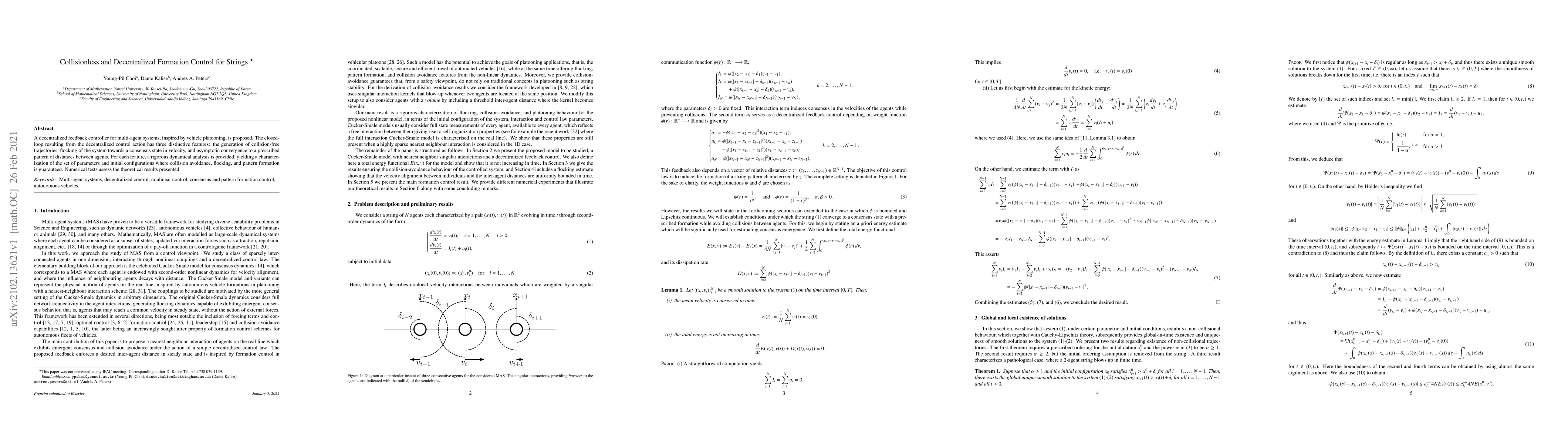 A decentralized control system is proposed to prevent collisions among multi-agent strings while maintaining a desired pattern of distances, achieving flocking behavior and asymptotic convergence towards consensus states.