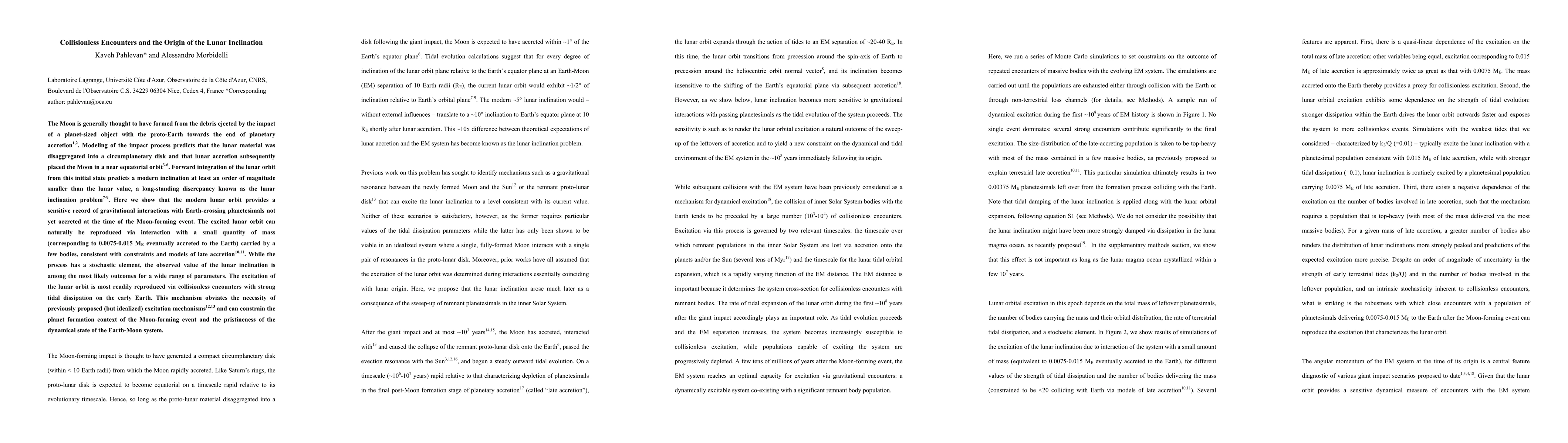 This paper proposes that the modern lunar inclination resulted from gravitational interactions with Earth-crossing planetesimals rather than the initial Moon-forming impact, resolving the lunar inclination problem through collisionless encounters and tidal dissipation. This model suggests that the Moon's current orbit is a record of late accretion processes in the Earth's vicinity.