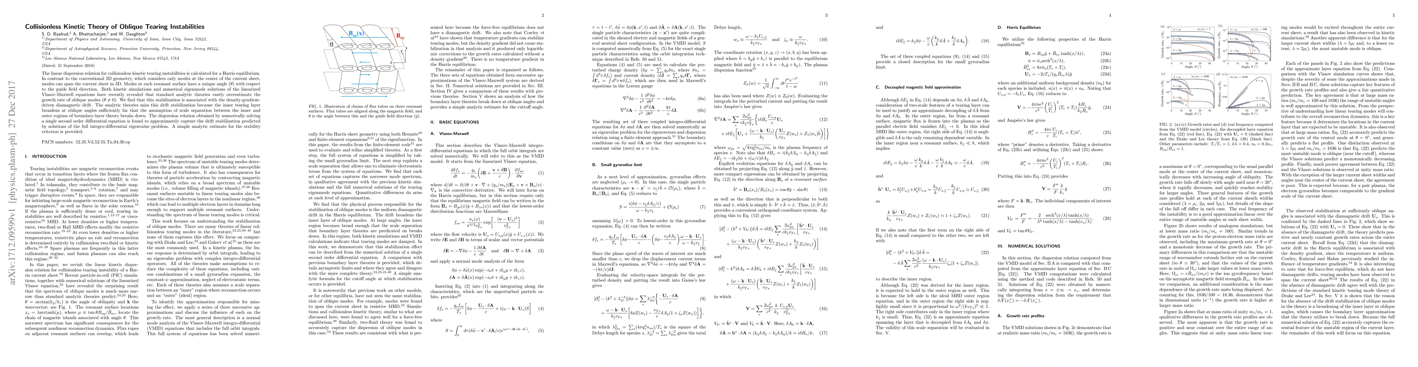 The linear dispersion relation for collisionless kinetic tearing instabilities is calculated for a Harris equilibrium. In contrast to the conventional 2D geometry, which considers only modes at the center of the current sheet, modes can span the current sheet in 3D. Modes at each resonant surface have a unique angle ($\theta$) with respect to the guide field direction. Both kinetic simulations and numerical eigenmode solutions of the linearized Vlasov-Maxwell equations have recently revealed that standard analytic theories vastly overestimate the growth rate of oblique modes ($\theta \neq 0$). We find that this stabilization is associated with the density-gradient-driven diamagnetic drift. The analytic theories miss this drift stabilization because the inner tearing layer broadens at oblique angles sufficiently far that the assumption of scale separation between the inner and outer regions of boundary-layer theory breaks down. The dispersion relation obtained by numerically solving a single second order differential equation is found to approximately capture the drift stabilization predicted by solutions of the full integro-differential eigenvalue problem. A simple analytic estimate for the stability criterion is provided.