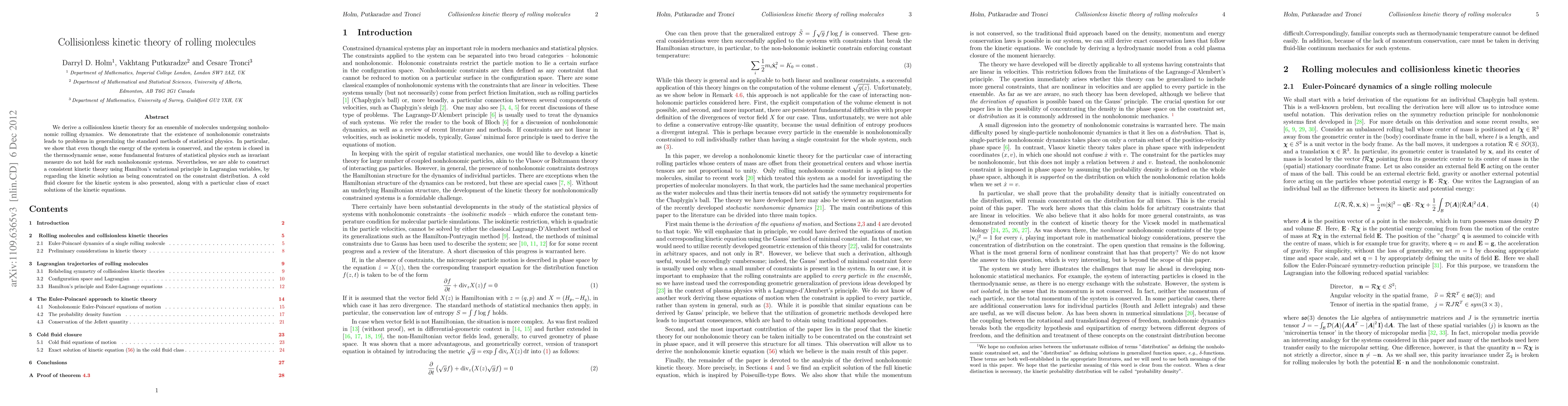 This paper develops a collisionless kinetic theory for rolling molecules constrained by nonholonomic dynamics, revealing that traditional statistical physics methods do not apply due to the lack of an invariant measure. A new kinetic theory is constructed using Hamilton's variational principle, and a cold fluid closure along with exact solutions is presented.