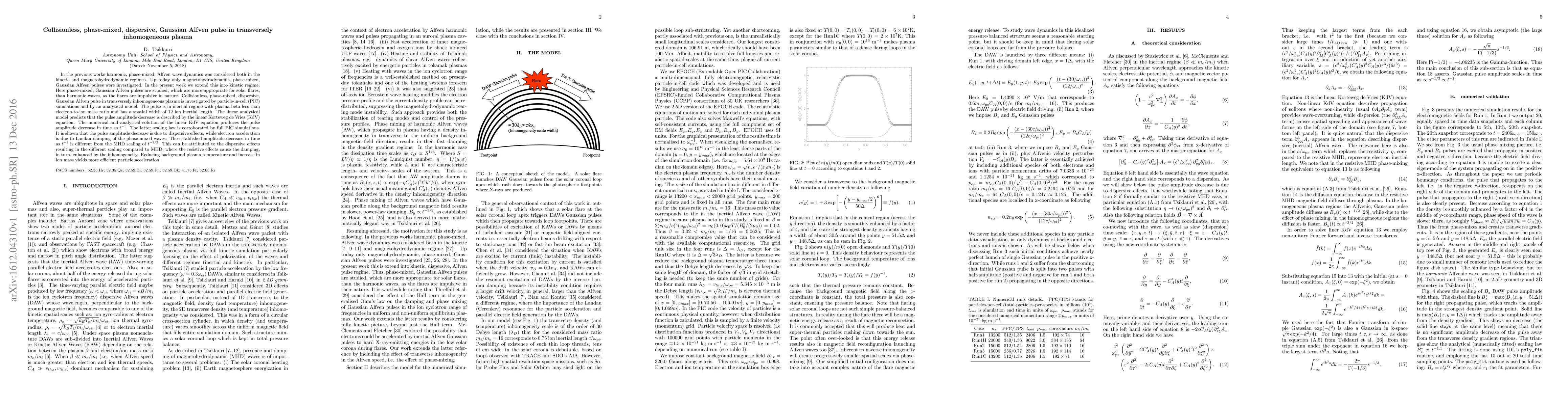 In the previous works harmonic, phase-mixed, Alfven wave dynamics was considered both in the kinetic and magnetohydrodynamic regimes. Up today only magnetohydrodynamic, phase-mixed, Gaussian Alfven pulses were investigated. In the present work we extend this into kinetic regime. Here phase-mixed, Gaussian Alfven pulses are studied, which are more appropriate for solar flares, than harmonic waves, as the flares are impulsive in nature. Collisionless, phase-mixed, dispersive, Gaussian Alfven pulse in transversely inhomogeneous plasma is investigated by particle-in-cell (PIC) simulations and by an analytical model. The pulse is in inertial regime with plasma beta less than electron-to-ion mass ratio and has a spatial width of 12 ion inertial length. The linear analytical model predicts that the pulse amplitude decrease is described by the linear Korteweg de Vries (KdV) equation. The numerical and analytical solution of the linear KdV equation produces the pulse amplitude decrease in time as $t^{-1}$. The latter scaling law is corroborated by full PIC simulations. It is shown that the pulse amplitude decrease is due to dispersive effects, while electron acceleration is due to Landau damping of the phase-mixed waves. The established amplitude decrease in time as $t^{-1}$ is different from the MHD scaling of $t^{-3/2}$. This can be attributed to the dispersive effects resulting in the different scaling compared to MHD, where the resistive effects cause the damping, in turn, enhanced by the inhomogeneity. Reducing background plasma temperature and increase in ion mass yields more efficient particle acceleration.