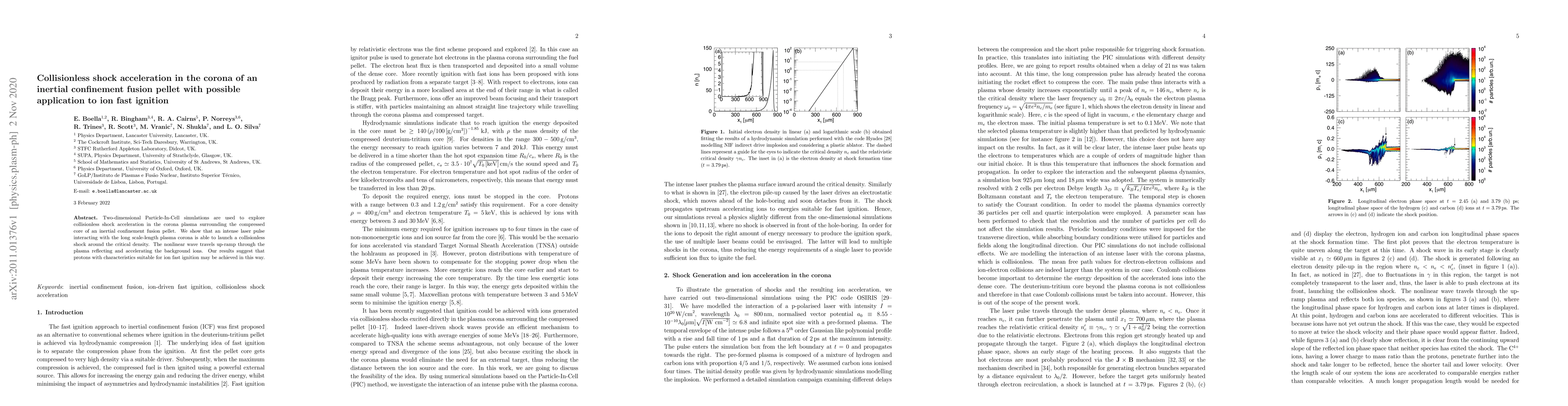 Two-dimensional simulations reveal that a laser pulse can generate a collisionless shock in the corona of an inertial confinement fusion pellet, accelerating background ions potentially suitable for ion fast ignition. This method leverages the long scale-length plasma corona to reflect and propel ions effectively.
