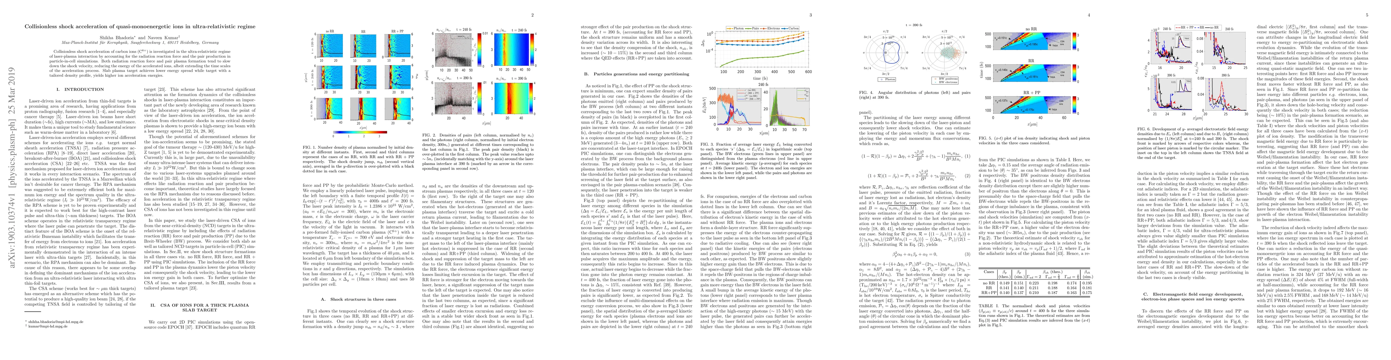 This paper investigates the collisionless shock acceleration of quasi-monoenergetic carbon ions in ultra-relativistic laser-plasma interactions, considering radiation reaction and pair production. The study finds that while these effects slow shock velocity and reduce ion energy, they extend acceleration timescales, with slab plasma targets achieving lower energy spread and tailored density profiles yielding higher acceleration energies.