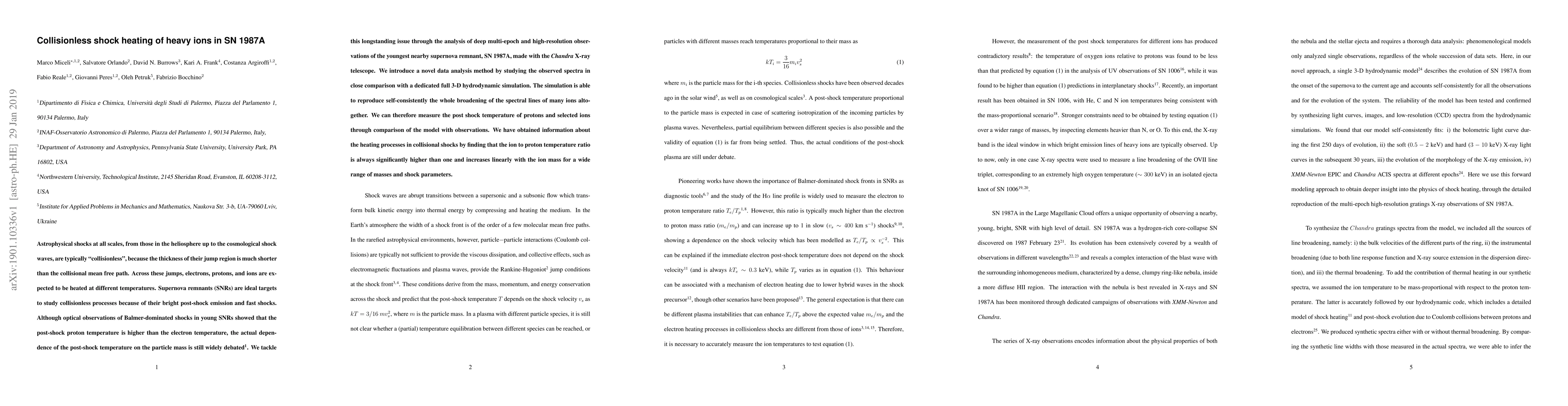 This paper investigates the heating of heavy ions in collisionless shocks using the supernova remnant SN 1987A, employing Chandra X-ray observations and advanced 3-D hydrodynamic simulations. It finds that the post-shock temperature of ions is significantly higher than that of protons and increases linearly with ion mass.