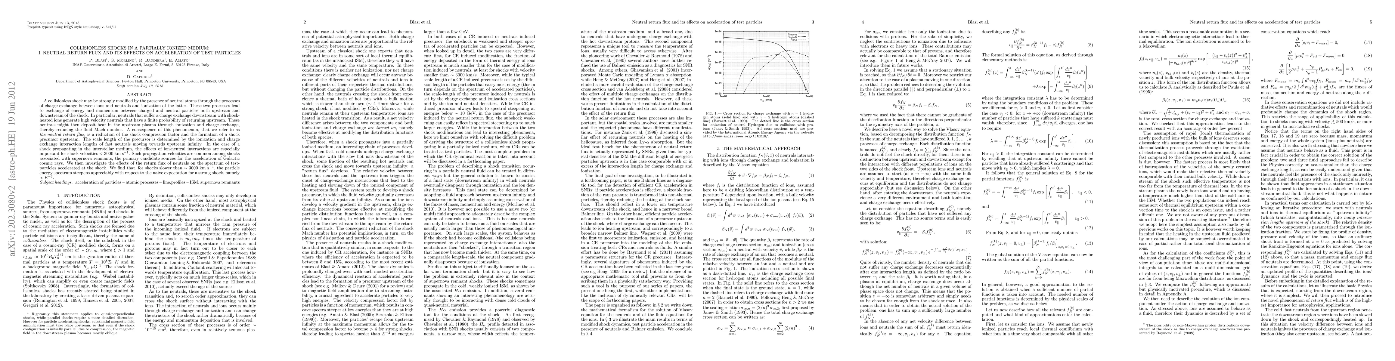 A collisionless shock may be strongly modified by the presence of neutral atoms through the processes of charge exchange between ions and neutrals and ionization of the latter. These two processes lead to exchange of energy and momentum between charged and neutral particles both upstream and downstream of the shock. In particular, neutrals that suffer a charge exchange downstream with shock-heated ions generate high velocity neutrals that have a finite probability of returning upstream. These neutrals might then deposit heat in the upstream plasma through ionization and charge exchange, thereby reducing the fluid Mach number. A consequence of this phenomenon, that we refer to as the "neutral return flux", is a reduction of the shock compression factor and the formation of a shock precursor upstream. The scale length of the precursor is determined by the ionization and charge exchange interaction lengths of fast neutrals moving towards upstream infinity. In the case of a shock propagating in the interstellar medium, the effects of ion-neutral interactions are especially important for shock velocities < 3000 km/s. Such propagation velocities are common among shocks associated with supernova remnants, the primary candidate sources for the acceleration of Galactic cosmic rays. We then investigate the effects of the return flux of neutrals on the spectrum of test-particles accelerated at the shock. We find that, for shocks slower than ~3000 km/s, the particle energy spectrum steepens appreciably with respect to the naive expectation for a strong shock, namely E^-2.