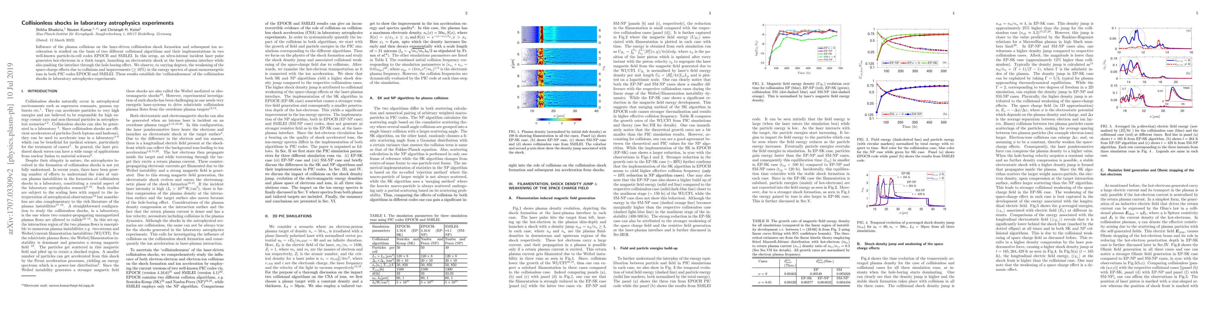This study investigates the impact of plasma collisions on laser-driven collisionless shock formation and ion acceleration using two particle-in-cell codes. Results show that collisions weaken space-charge effects and enhance ion energy spectra by at least 10%, confirming the "collisionlessness" of these shocks in laboratory astrophysics.
