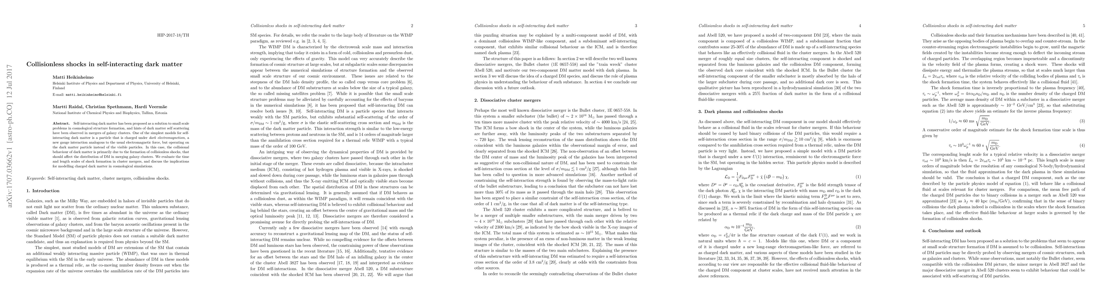 This paper investigates collisionless shocks in self-interacting dark matter, particularly focusing on a model where dark matter particles are charged under dark electromagnetism. The study evaluates the time and length scales of shock formation during galaxy cluster mergers and discusses implications for cosmological simulations.