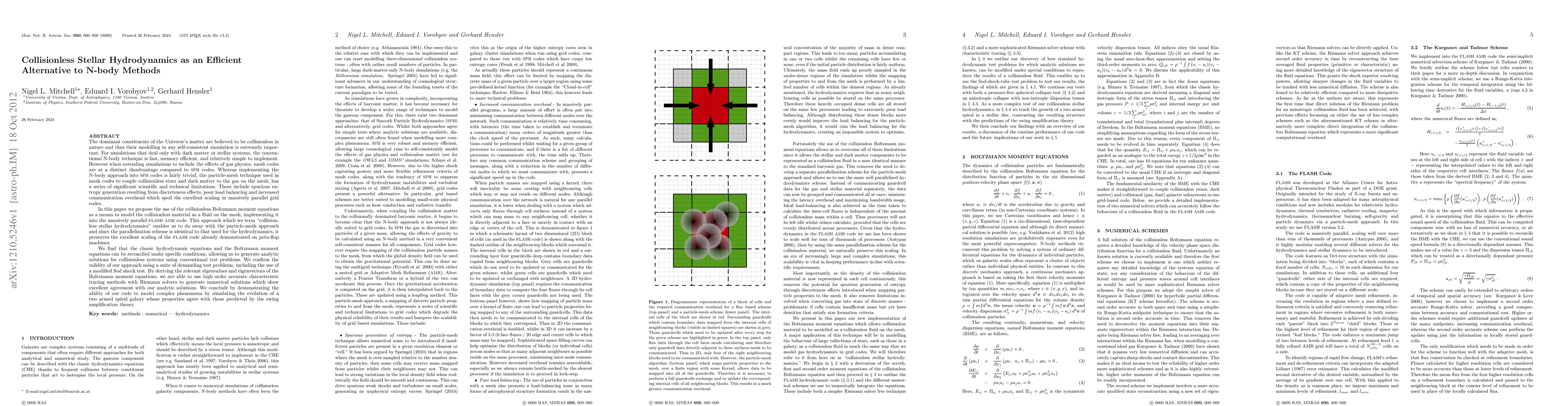 This paper proposes collisionless stellar hydrodynamics as an efficient alternative to N-body methods for simulations involving gas physics, addressing limitations of particle-mesh techniques. It integrates collisionless Boltzmann moment equations into the FLASH AMR code, preserving parallel scaling and demonstrating its effectiveness through complex galaxy simulations.