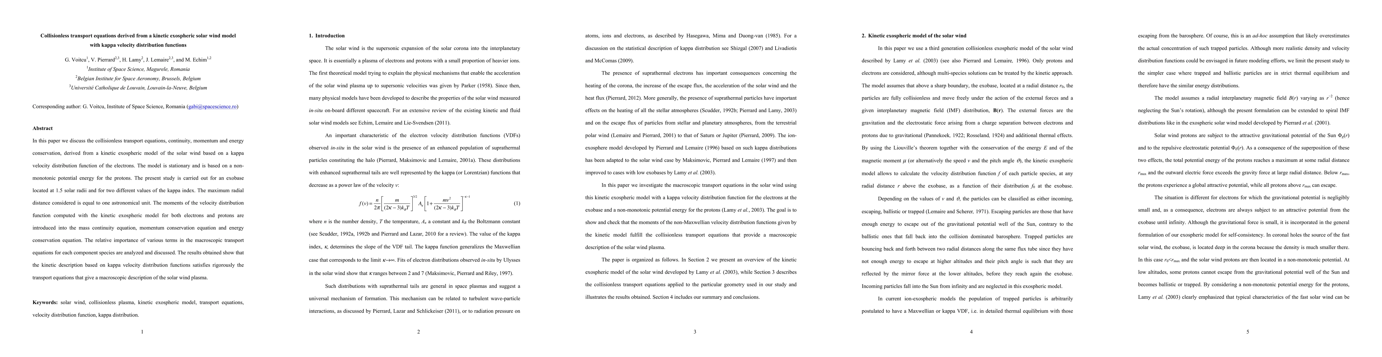 This paper derives collisionless transport equations for a solar wind model based on a kinetic exospheric approach with kappa velocity distribution functions for electrons. The study analyzes the relative importance of terms in the transport equations for both electrons and protons, showing that the kappa distribution provides a valid macroscopic description of solar wind plasma.