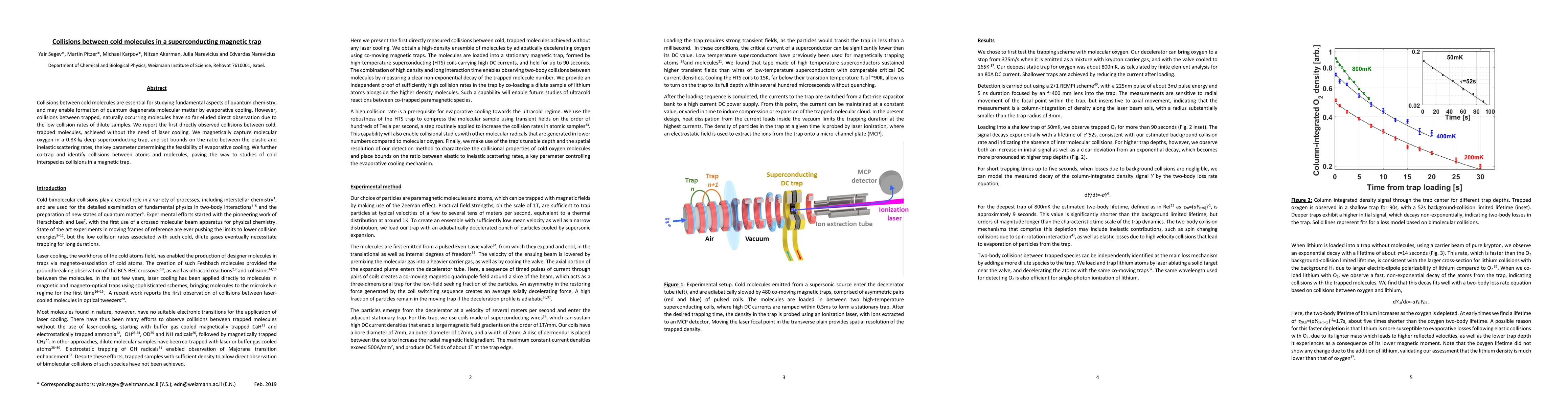 This paper reports the first direct observation of collisions between cold, trapped molecules using magnetic trapping without laser cooling, capturing molecular oxygen in a superconducting trap. It sets bounds on the ratio of elastic to inelastic scattering rates, crucial for evaporative cooling, and identifies collisions between atoms and molecules, advancing the study of interspecies collisions in magnetic traps.