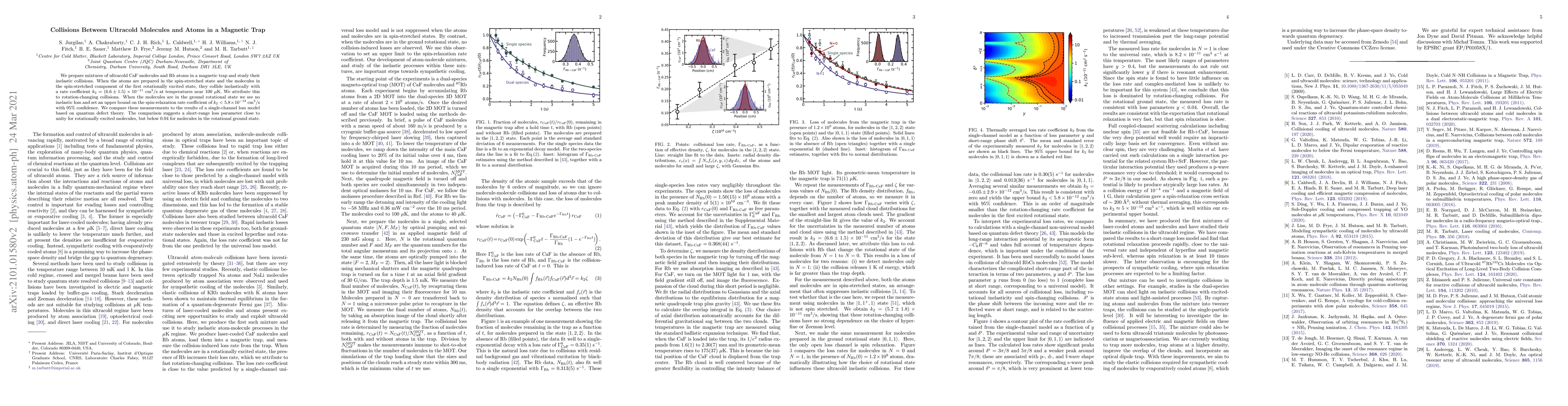 We prepare mixtures of ultracold CaF molecules and Rb atoms in a magnetic trap and study their inelastic collisions. When the atoms are prepared in the spin-stretched state and the molecules in the spin-stretched component of the first rotationally excited state, they collide inelastically with a rate coefficient of $k_2 = (6.6 \pm 1.5) \times 10^{-11}$ cm$^{3}$/s at temperatures near 100~$\mu$K. We attribute this to rotation-changing collisions. When the molecules are in the ground rotational state we see no inelastic loss and set an upper bound on the spin relaxation rate coefficient of $k_2 < 5.8 \times 10^{-12}$ cm$^{3}$/s with 95% confidence. We compare these measurements to the results of a single-channel loss model based on quantum defect theory. The comparison suggests a short-range loss parameter close to unity for rotationally excited molecules, but below 0.04 for molecules in the rotational ground state.