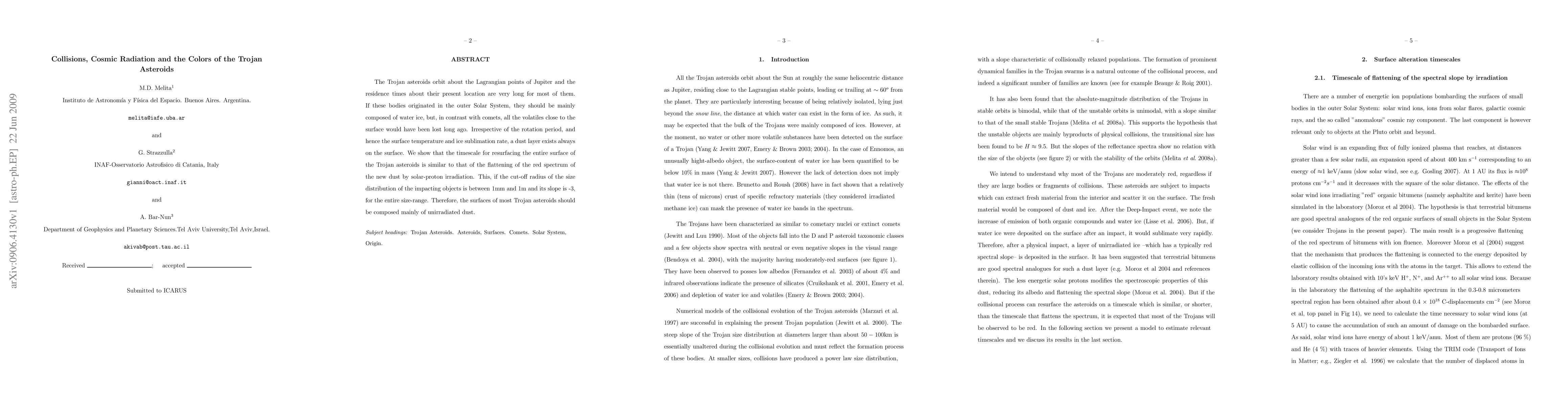 The Trojan asteroids, which orbit Jupiter's Lagrangian points, are expected to be composed of water ice but have lost surface volatiles. The resurfacing timescale matches the flattening of the dust spectrum due to solar-proton irradiation, suggesting most surfaces are covered in unirradiated dust.
