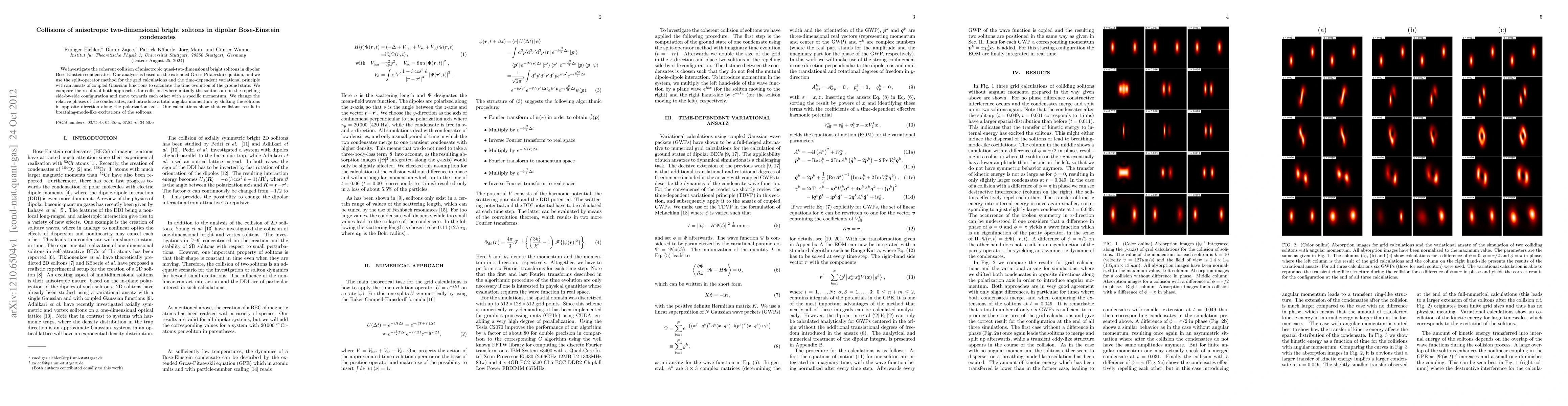 The study examines the interactions of anisotropic solitons in dipolar Bose-Einstein condensates using the extended Gross-Pitaevskii equation and computational methods, revealing breathing-mode-like excitations upon collision influenced by relative phases and angular momentum.