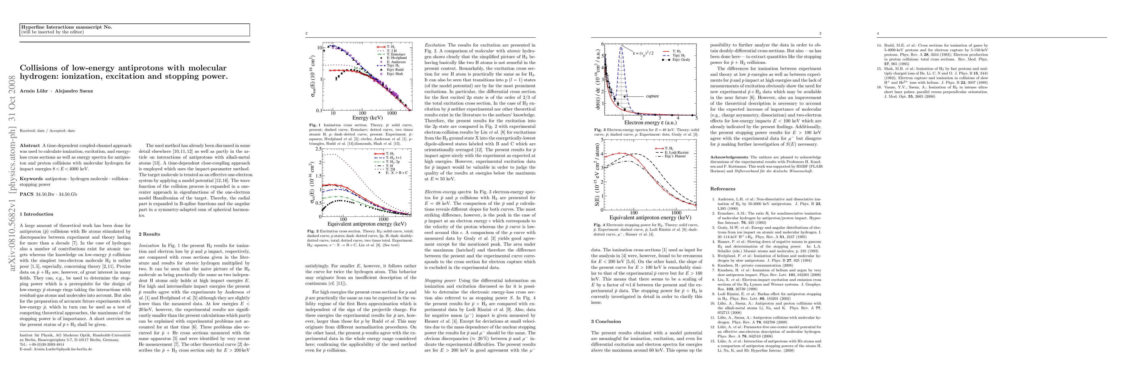 This study employs a time-dependent coupled-channel approach to determine ionization, excitation, and energy-loss cross sections for low-energy antiproton and proton collisions with molecular hydrogen, ranging from 8 keV to 4000 keV. The research also provides detailed energy spectra for these interactions.