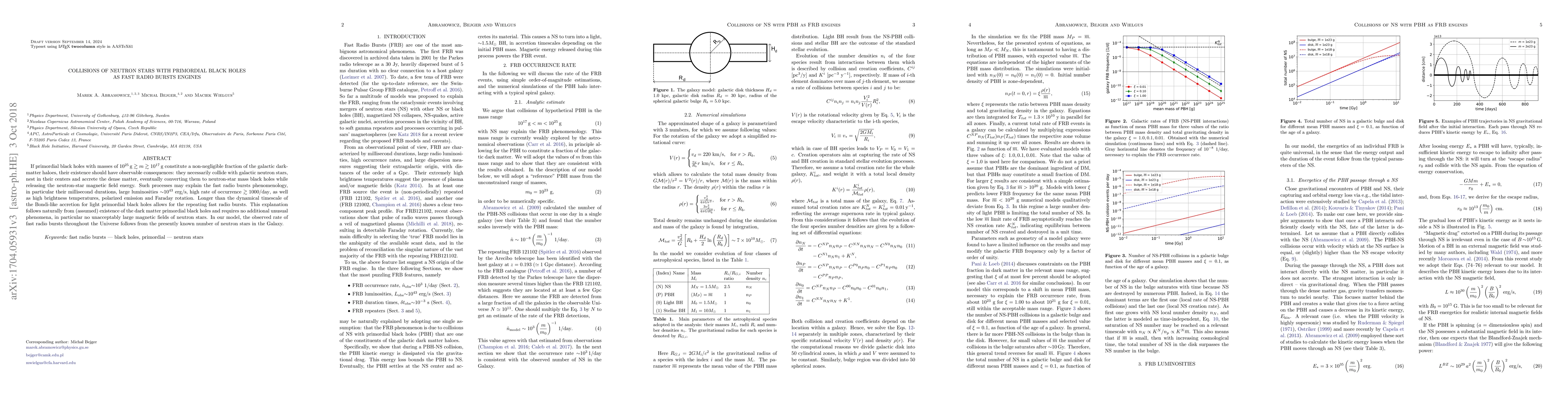 If primordial black holes with masses of $10^{25}\,\mbox{g}\gtrsim m \gtrsim 10^{17}\,\mbox{g}$ constitute a non-negligible fraction of the galactic dark-matter haloes, their existence should have observable consequences: they necessarily collide with galactic neutron stars, nest in their centers and accrete the dense matter, eventually converting them to neutron-star mass black holes while releasing the neutron-star magnetic field energy. Such processes may explain the fast radio bursts phenomenology, in particular their millisecond durations, large luminosities ${\sim}10^{43}$ erg/s, high rate of occurrence $\gtrsim 1000/\mbox{day}$, as well as high brightness temperatures, polarized emission and Faraday rotation. Longer than the dynamical timescale of the Bondi-like accretion for light primordial black holes allows for the repeating fast radio bursts. This explanation follows naturally from (assumed) existence of the dark matter primordial black holes and requires no additional unusual phenomena, in particular no unacceptably large magnetic fields of neutron stars. In our model, the observed rate of fast radio bursts throughout the Universe follows from the presently known number of neutron stars in the Galaxy.