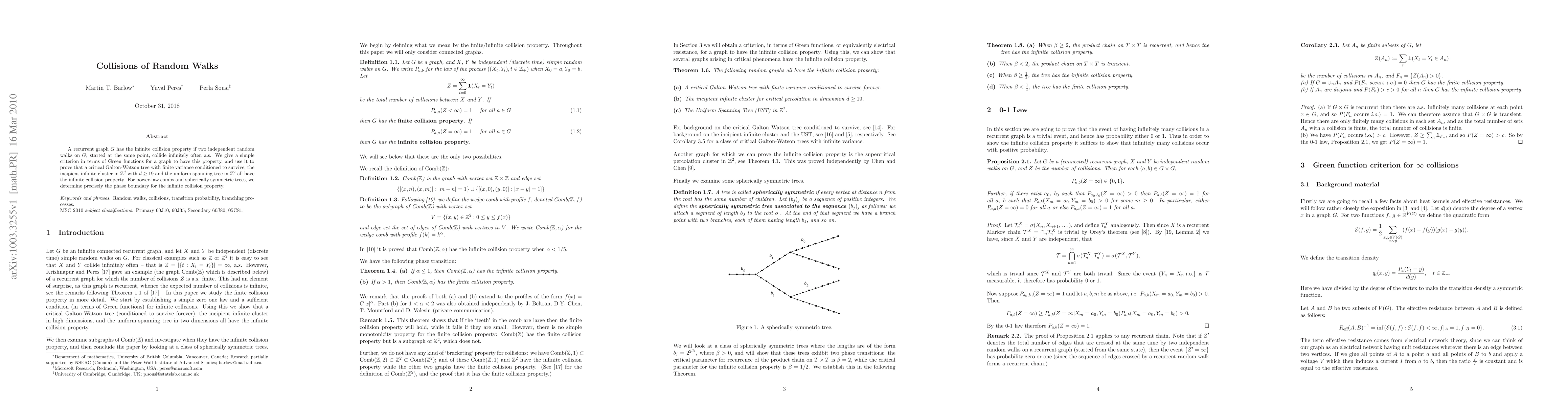This paper provides a criterion using Green functions to determine if a recurrent graph has the infinite collision property for independent random walks. It applies this criterion to show that certain structures, including conditioned Galton-Watson trees and spanning trees in specific dimensions, exhibit this property.