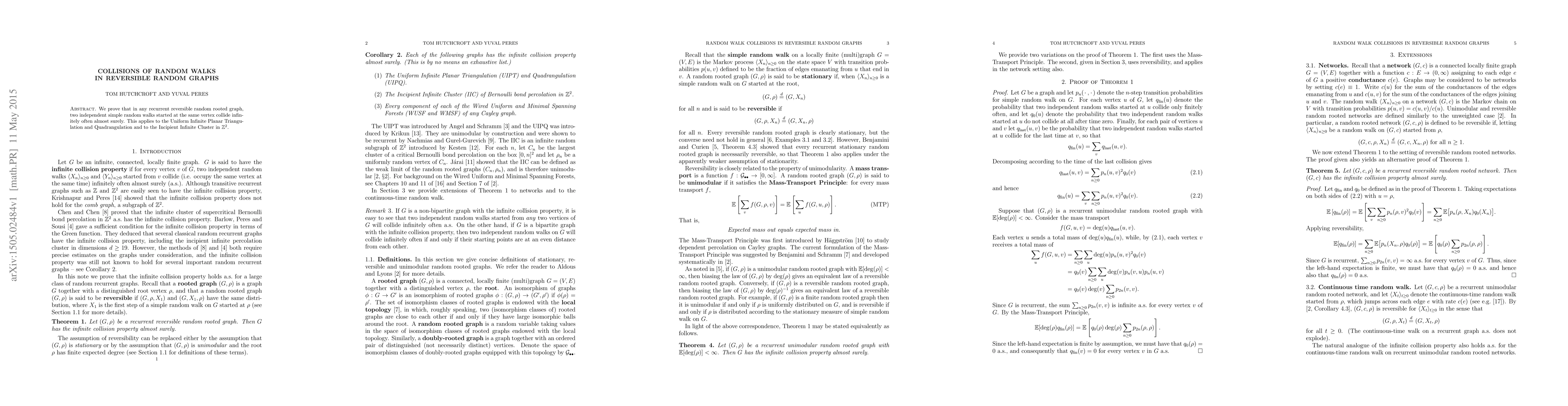 The paper establishes a connection between reversibility and unimodularity in random rooted graphs, proving infinite collisions for recurrent unimodular random rooted graphs and extending the result to networks and continuous-time random walks.