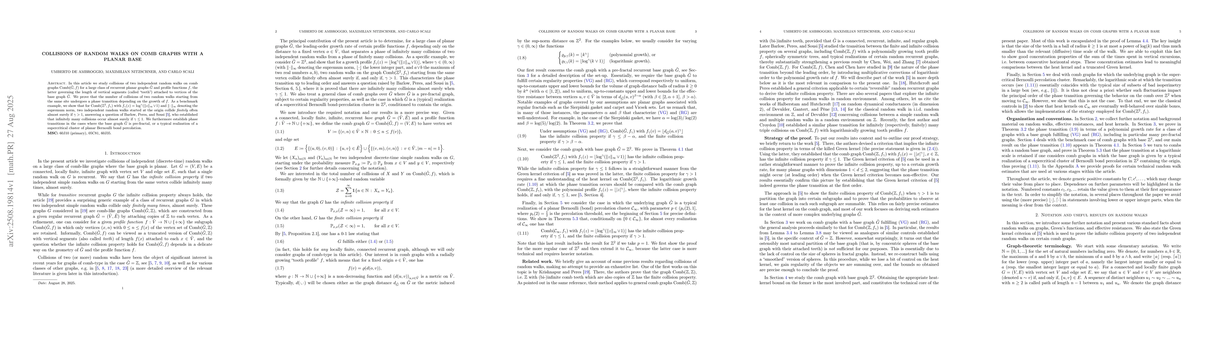 In this article we study collisions of two independent random walks on comb graphs $\mathrm{Comb}(\tilde{G},f)$ for a large class of recurrent planar graphs $\tilde{G}$ and profile functions $f$, the latter governing the length of vertical segments (called "teeth") attached to vertices of the base graph $\tilde{G}$. We prove that the number of collisions of two random walks starting from the same site undergoes a phase transition depending on the growth of $f$. As a benchmark example, we show that for $\mathrm{Comb}(\mathbb{Z}^2,f_\gamma)$ with $f_\gamma(z) = \log^{\gamma}(\|z\|_\infty\vee 1)$ and $\|\cdot \|_\infty$ denoting the supremum norm, two independent random walks started at the origin collide finitely often almost surely if $\gamma > 1$, answering a question of Barlow, Peres, and Sousi, see arXiv:1003.3255, who established that infinitely many collisions occur almost surely if $\gamma \leq 1$. We furthermore establish phase transitions in the cases where the base graph $\tilde{G}$ is pre-fractal, or a typical realization of a supercritical cluster of planar Bernoulli bond percolation.