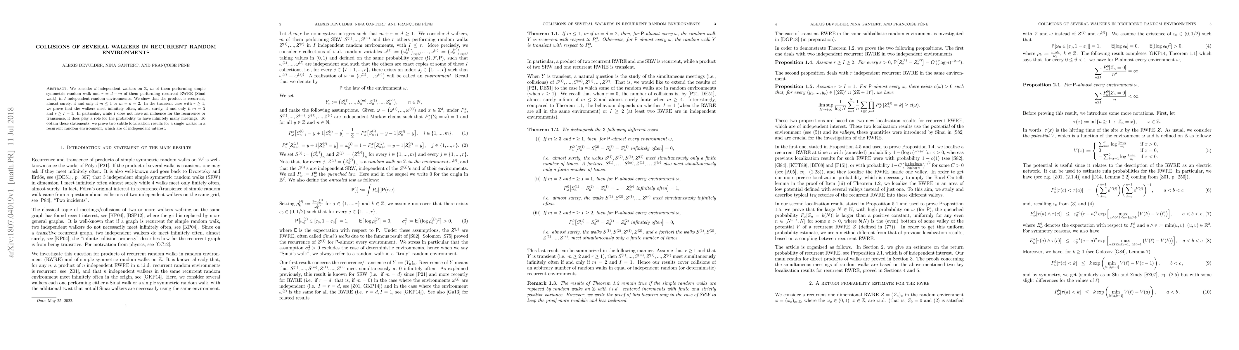 Researchers studied collisions of walkers in random environments, finding that the product is recurrent if most walkers perform simple symmetric walks or pairs of recurrent walks, but transient if more than two walkers perform recurrent walks.