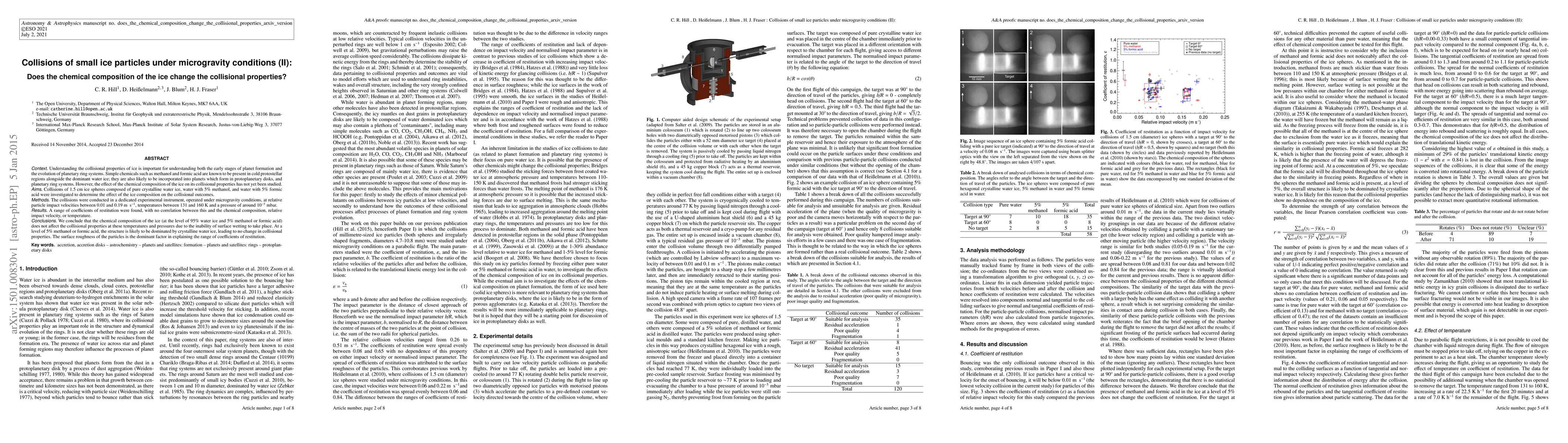 Context: Understanding the collisional properties of ice is important for understanding both the early stages of planet formation and the evolution of planetary ring systems. Simple chemicals such as methanol and formic acid are known to be present in cold protostellar regions alongside the dominant water ice; they are also likely to be incorporated into planets which form in protoplanetary disks, and planetary ring systems. However, the effect of the chemical composition of the ice on its collisional properties has not yet been studied. Aims: Collisions of 1.5 cm ice spheres composed of pure crystalline water ice, water with 5% methanol, and water with 5% formic acid were investigated to determine the effect of the ice composition on the collisional outcomes. Methods: The collisions were conducted in a dedicated experimental instrument, operated under microgravity conditions, at relative particle impact velocities between 0.01 and 0.19 m s^-1, temperatures between 131 and 160 K and a pressure of around 10^-5 mbar. Results: A range of coefficients of restitution were found, with no correlation between this and the chemical composition, relative impact velocity, or temperature. Conclusions: We conclude that the chemical composition of the ice (at the level of 95% water ice and 5% methanol or formic acid) does not affect the collisional properties at these temperatures and pressures due to the inability of surface wetting to take place. At a level of 5% methanol or formic acid, the structure is likely to be dominated by crystalline water ice, leading to no change in collisional properties. The surface roughness of the particles is the dominant factor in explaining the range of coefficients of restitution.