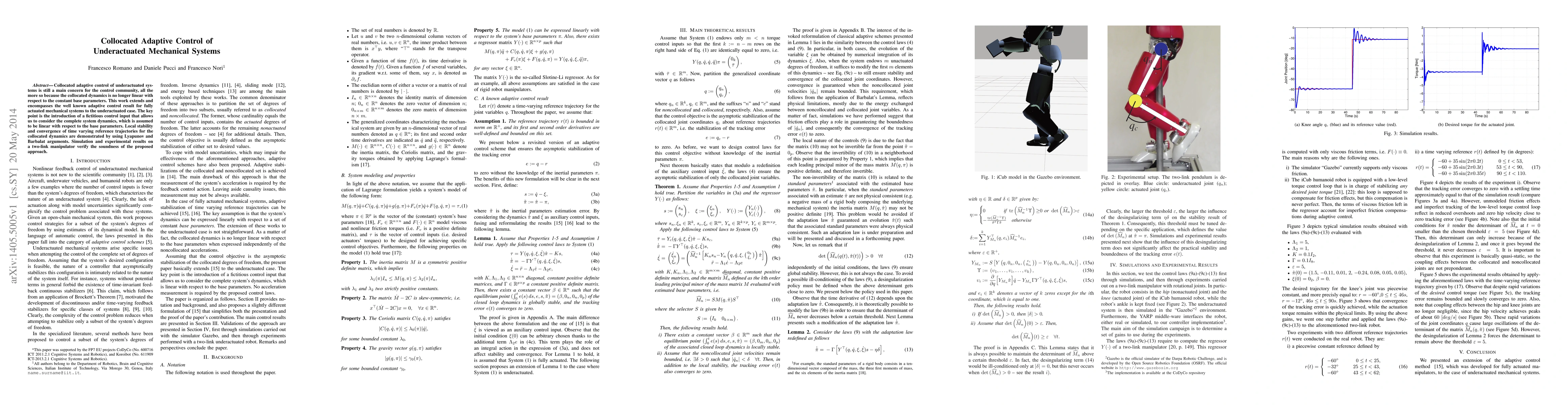 The paper presents a collocated adaptive control method for underactuated mechanical systems, introducing a fictitious control input to handle non-linear dynamics and demonstrating local stability and convergence through Lyapunov and Barbalat arguments.