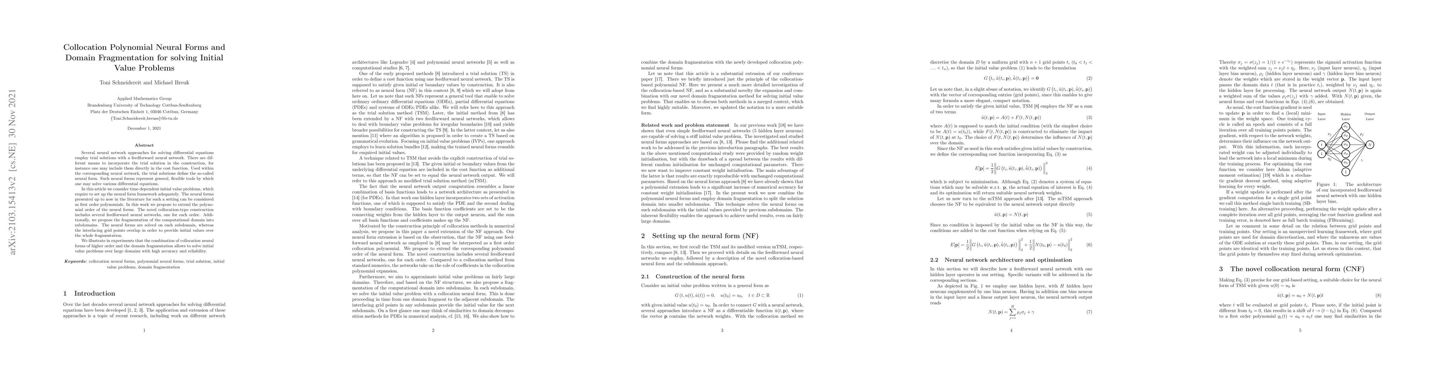 Several neural network approaches for solving differential equations employ trial solutions with a feedforward neural network. There are different means to incorporate the trial solution in the construction, for instance one may include them directly in the cost function. Used within the corresponding neural network, the trial solutions define the so-called neural form. Such neural forms represent general, flexible tools by which one may solve various differential equations. In this article we consider time-dependent initial value problems, which require to set up the neural form framework adequately. The neural forms presented up to now in the literature for such a setting can be considered as first order polynomials. In this work we propose to extend the polynomial order of the neural forms. The novel collocation-type construction includes several feedforward neural networks, one for each order. Additionally, we propose the fragmentation of the computational domain into subdomains. The neural forms are solved on each subdomain, whereas the interfacing grid points overlap in order to provide initial values over the whole fragmentation. We illustrate in experiments that the combination of collocation neural forms of higher order and the domain fragmentation allows to solve initial value problems over large domains with high accuracy and reliability.