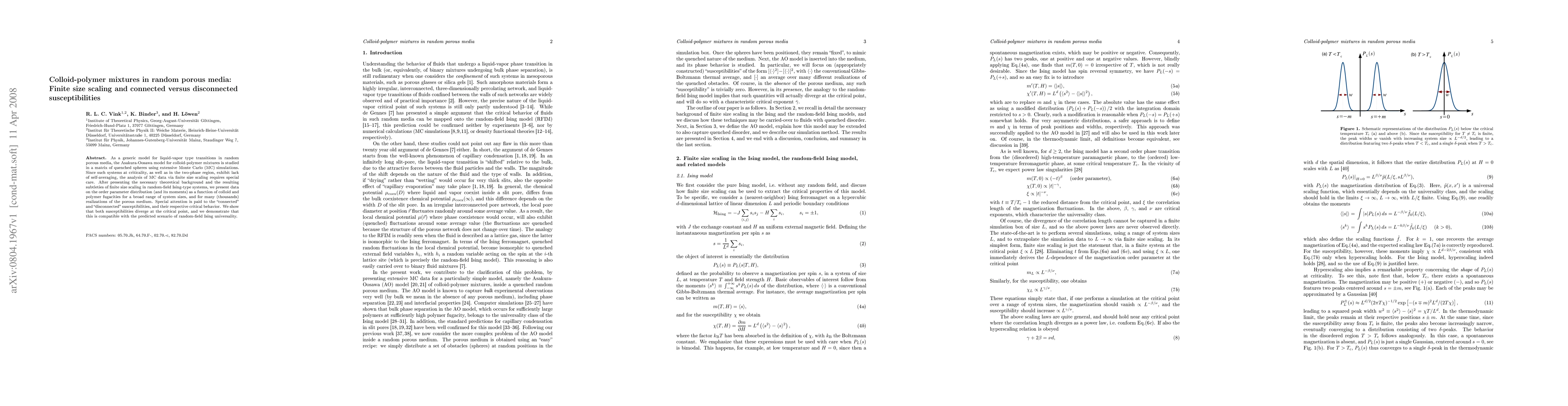 This paper investigates the Asakura-Oosawa model for colloid-polymer mixtures in random porous media using Monte Carlo simulations, focusing on the critical behavior of connected and disconnected susceptibilities. It demonstrates finite size scaling and confirms their divergence at the critical point, aligning with random-field Ising universality.
