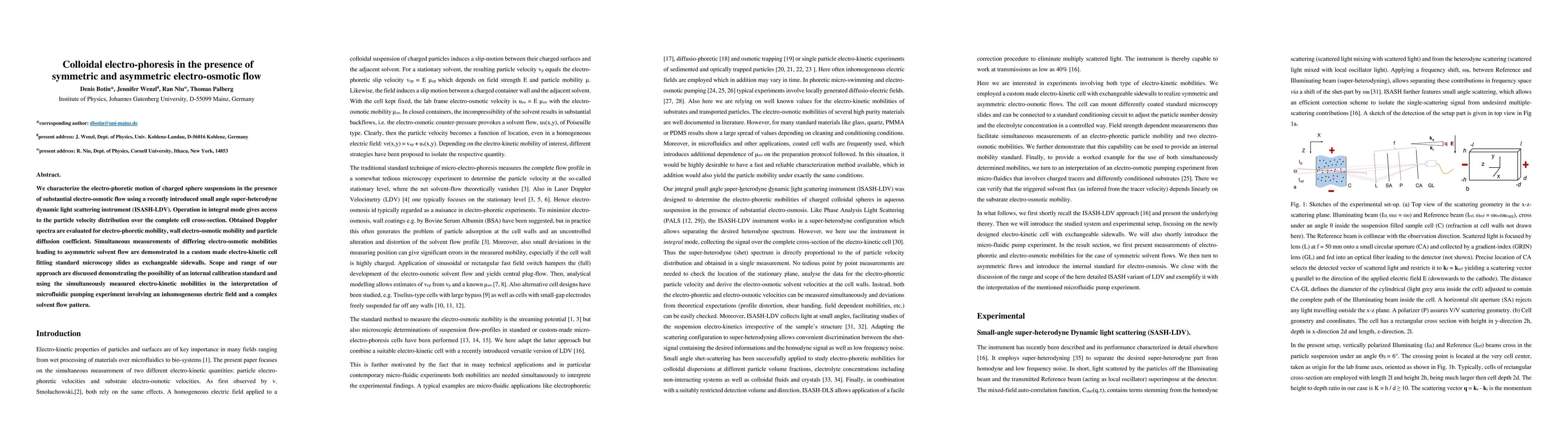 We characterize the electro-phoretic motion of charged sphere suspensions in the presence of substantial electro-osmotic flow using a recently introduced small angle super-heterodyne dynamic light scattering instrument (ISASH-LDV). Operation in integral mode gives access to the particle velocity distribution over the complete cell cross-section. Obtained Doppler spectra are evaluated for electro-phoretic mobility, wall electro-osmotic mobility and particle diffusion coefficient. Simultaneous measurements of differing electro-osmotic mobilities leading to asymmetric solvent flow are demonstrated in a custom made electro-kinetic cell fitting standard microscopy slides as exchangeable sidewalls. Scope and range of our approach are discussed demonstrating the possibility of an internal calibration standard and using the simultaneously measured electro-kinetic mobilities in the interpretation of microfluidic pumping experiment involving an inhomogeneous electric field and a complex solvent flow pattern.