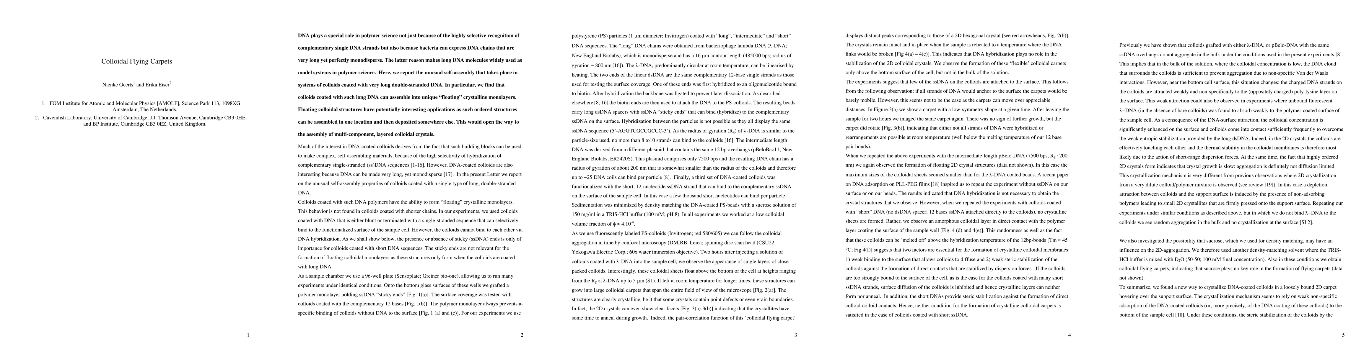 DNA plays a special role in polymer science not just because of the highly selective recognition of complementary single DNA strands but also because bacteria can express DNA chains that are very long yet perfectly monodisperse. The latter reason makes long DNA molecules widely used as model systems in polymer science. Here, we report the unusual self-assembly that takes place in systems of colloids coated with very long double-stranded DNA. In particular, we find that colloids coated with such long DNA can assemble into unique floating crystalline monolayers. Floating colloidal structures have potentially interesting applications as such ordered structures can be assembled in one location and then deposited somewhere else. This would open the way to the assembly of multi-component, layered colloidal crystals.