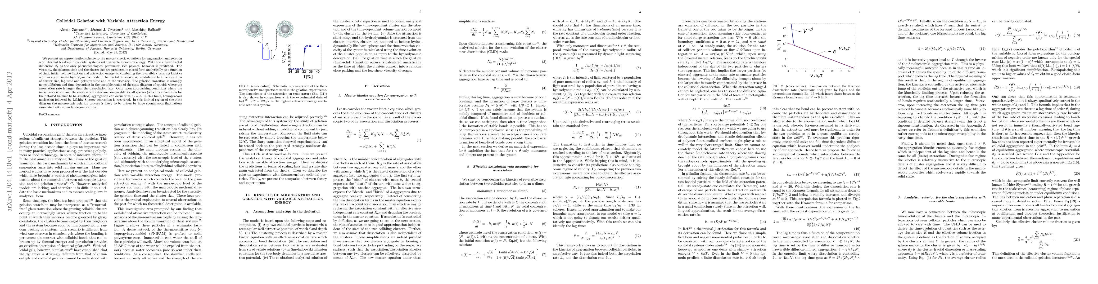 This research develops an approximation scheme to study colloidal gelation with variable attraction energy, predicting viscosity, gelation time, and cluster size through reversible clustering kinetics and an approximate hydrodynamic model. The cluster fractal dimension $d_{f}$ is the key phenomenological parameter modulating the time evolution of these properties, with gelation occurring nonequilibrium and time-dependently in regions where association exceeds dissociation.