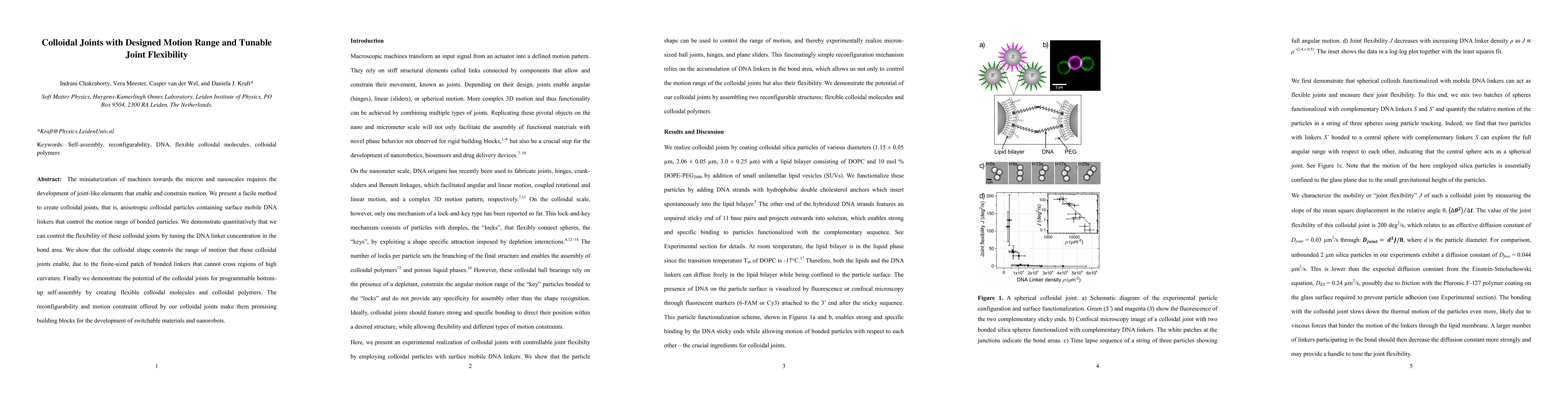 This paper presents a method to create colloidal joints with adjustable motion range and flexibility using DNA linkers, enabling programmable self-assembly of colloidal molecules and polymers. The flexibility is tunable via DNA linker concentration, and shape-dependent motion constraints are demonstrated, highlighting potential for switchable materials and nanorobots.