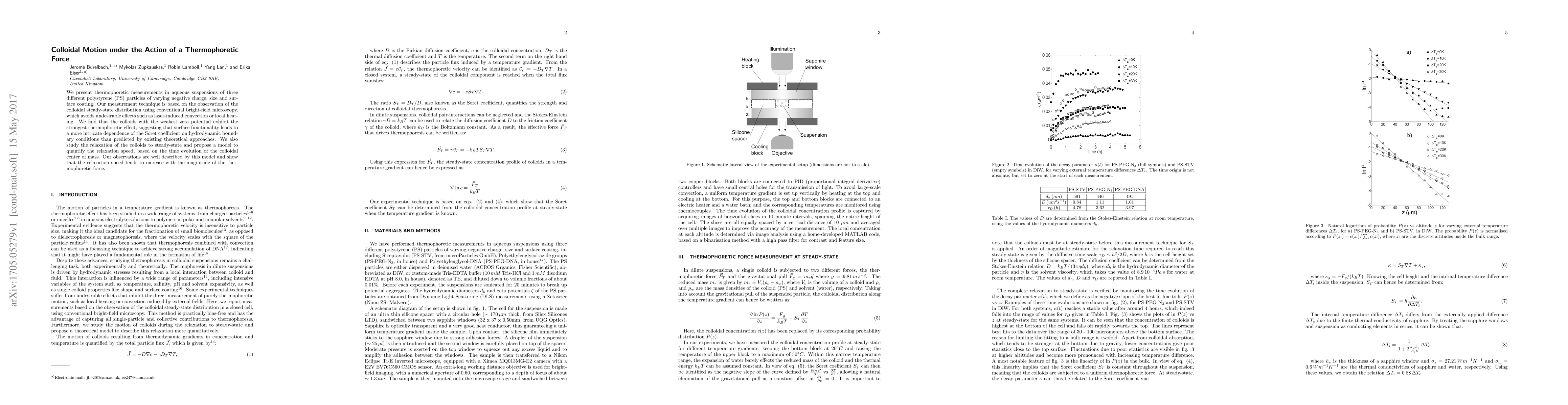 We present thermophoretic measurements in aqueous suspensions of three different polystyrene (PS) particles of varying negative charge, size and surface coating. Our measurement technique is based on the observation of the colloidal steady-state distribution using conventional bright-field microscopy, which avoids undesirable effects such as laser-induced convection or local heating. We find that the colloids with the weakest zeta potential exhibit the strongest thermophoretic effect, suggesting that surface functionality leads to a more intricate dependence of the Soret coefficient on hydrodynamic boundary conditions than predicted by existing theoretical approaches. We also study the relaxation of the colloids to steady-state and propose a model to quantify the relaxation speed, based on the time evolution of the colloidal center of mass. Our observations are well described by this model and show that the relaxation speed tends to increase with the magnitude of the thermophoretic force.