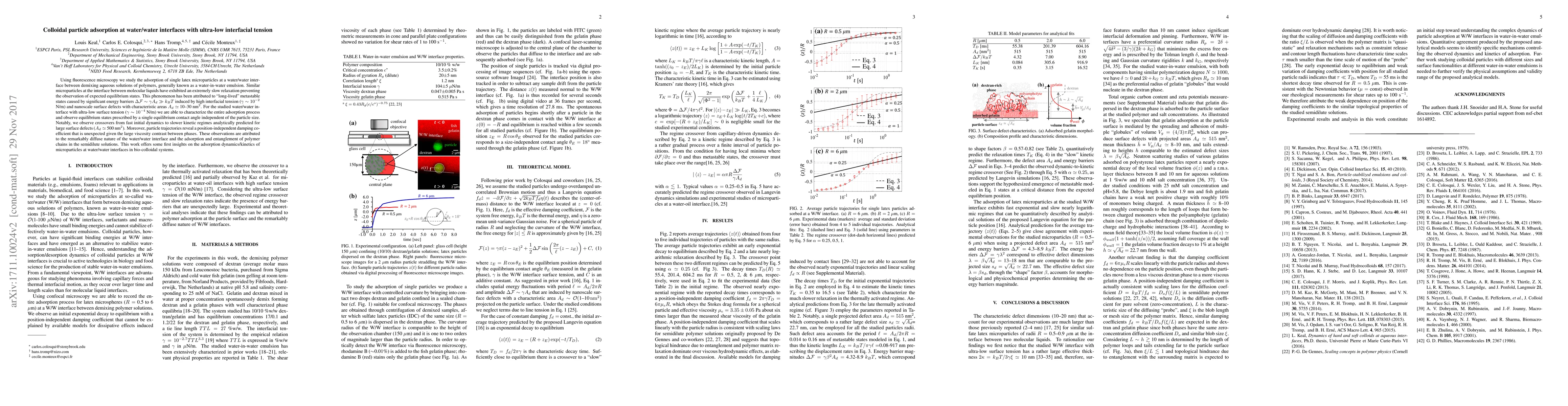 This study uses fluorescence microscopy to investigate the adsorption of latex microparticles at a water/water interface with ultra-low interfacial tension, revealing fast initial dynamics and equilibrium states due to the diffuse nature of the interface and polymer chain entanglement. The observed kinetics differ from those at high interfacial tension, highlighting the unique dynamics at such low-tension interfaces.