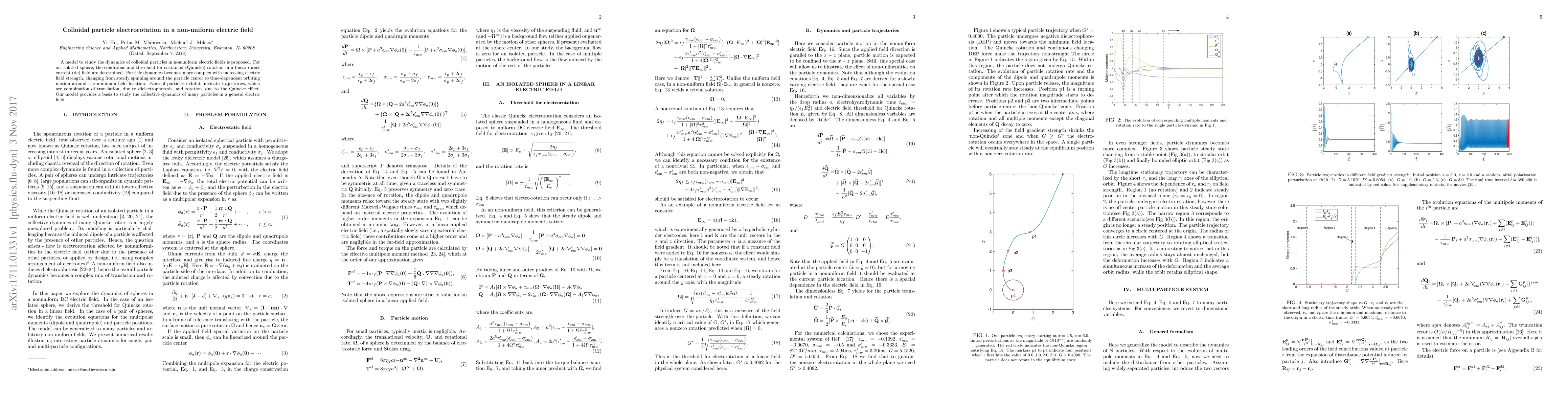 A model to study the dynamics of colloidal particles in nonuniform electric fields is proposed. For an isolated sphere, the conditions and threshold for sustained (Quincke) rotation in a linear direct current (dc) field are determined. Particle dynamics becomes more complex with increasing electric field strength, changing from steady spinning around the particle center to time-dependent orbiting motion around the minimum field location. Pairs of particles exhibit intricate trajectories, which are combination of translation, due to dielectrophoresis, and rotation, due to the Quincke effect. Our model provides a basis to study the collective dynamics of many particles in a general electric field.