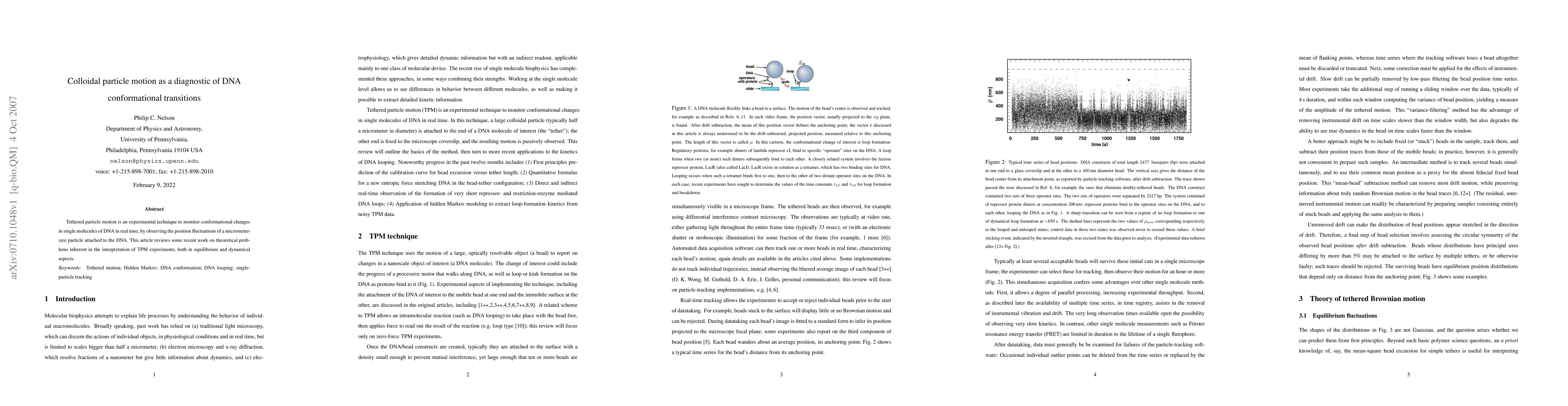 This article reviews theoretical challenges in interpreting tethered particle motion (TPM) experiments, which track DNA conformational changes by observing the fluctuations of attached micrometer-size particles, focusing on both equilibrium and dynamic aspects. The study aims to improve the understanding of DNA transitions through colloidal particle motion analysis.