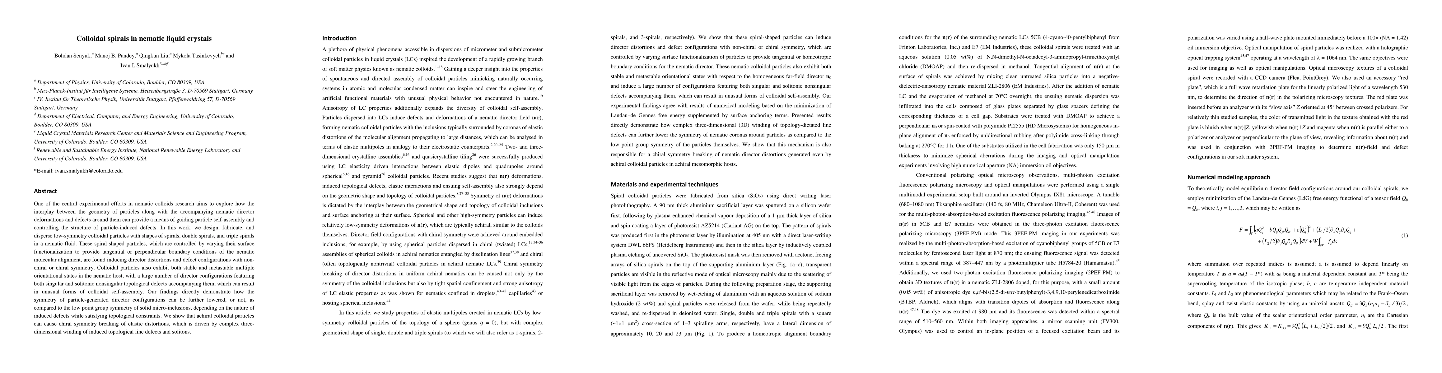 This research explores how spiral-shaped colloidal particles in nematic liquid crystals induce unique director distortions and defect configurations, leading to varied colloidal self-assembly states. The study reveals that the symmetry of these induced configurations can be manipulated by controlling particle surface functionalization, resulting in both stable and metastable orientational states with complex topological defects.