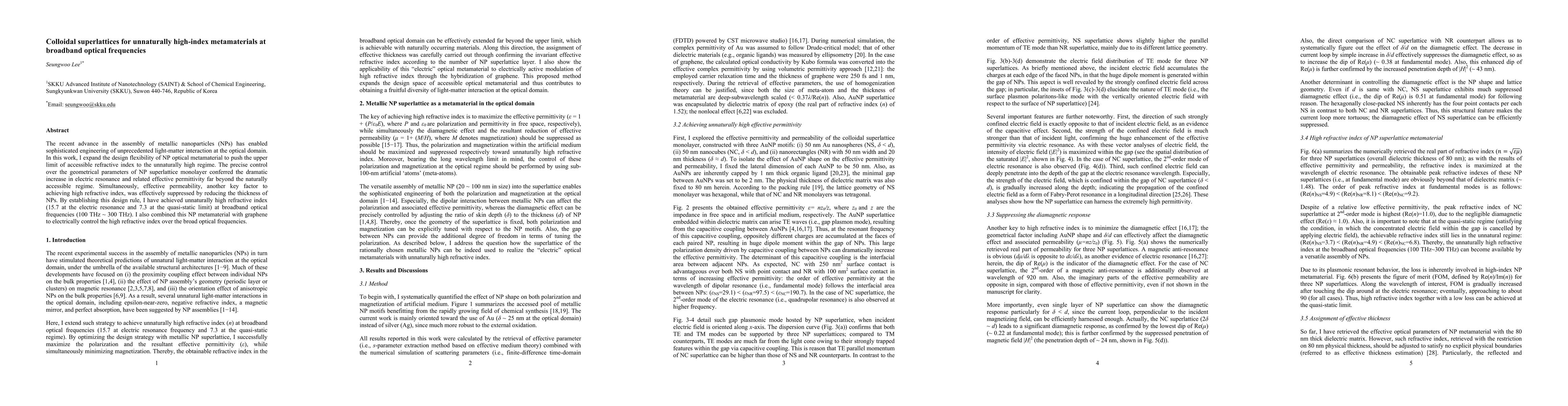 This paper explores the assembly of metallic nanoparticle superlattices to engineer metamaterials with unnaturally high refractive indices at broadband optical frequencies. The design achieves a refractive index of up to 15.7 through precise control of nanoparticle geometry and thickness, and combines with graphene for electrical tunability.