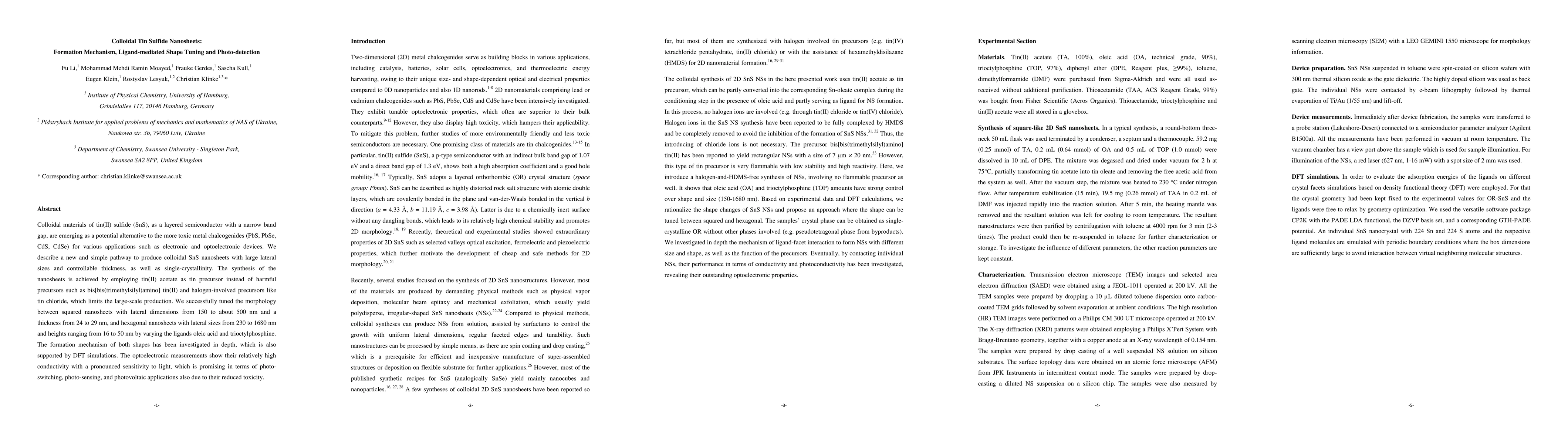 This paper presents a method for synthesizing colloidal tin(II) sulfide (SnS) nanosheets with controlled size and thickness using tin(II) acetate, which is less toxic than traditional precursors. The researchers tuned the nanosheets' shape using ligands, achieving squared and hexagonal forms, and demonstrated their potential for photo-detection due to high conductivity and light sensitivity.