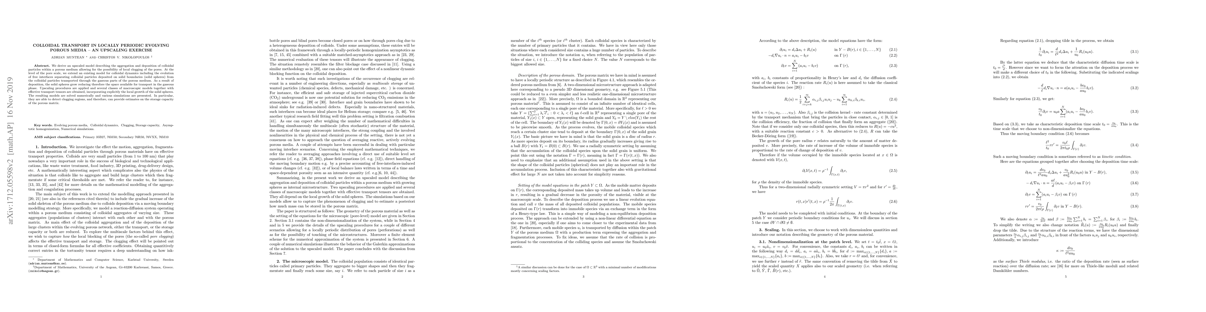 The paper presents a detailed upscaling approach for colloidal transport models in evolving porous media, incorporating local clogging effects and providing effective macroscopic models.