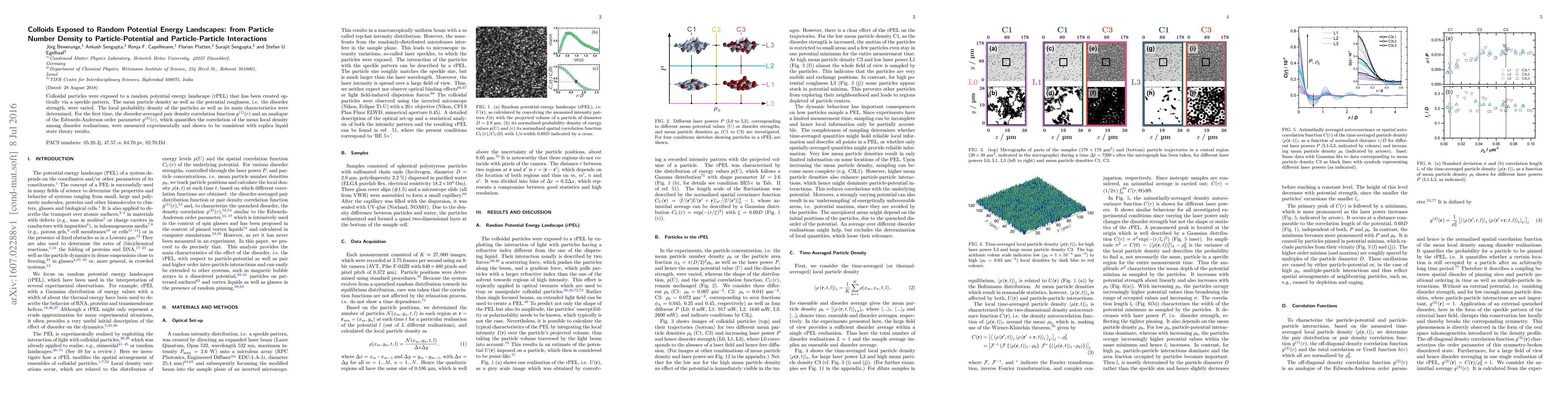 Colloidal particles were exposed to a random potential energy landscape (rPEL) that has been created optically via a speckle pattern. The mean particle density as well as the potential roughness, i.e. the disorder strength, were varied. The local probability density of the particles as well as its main characteristics were determined. For the first time, the disorder-averaged pair density correlation function and an analogue of the Edwards-Anderson order parameter, which quantifies the correlation of the mean local density among disorder realisations, were measured experimentally and shown to be consistent with replica liquid state theory results.