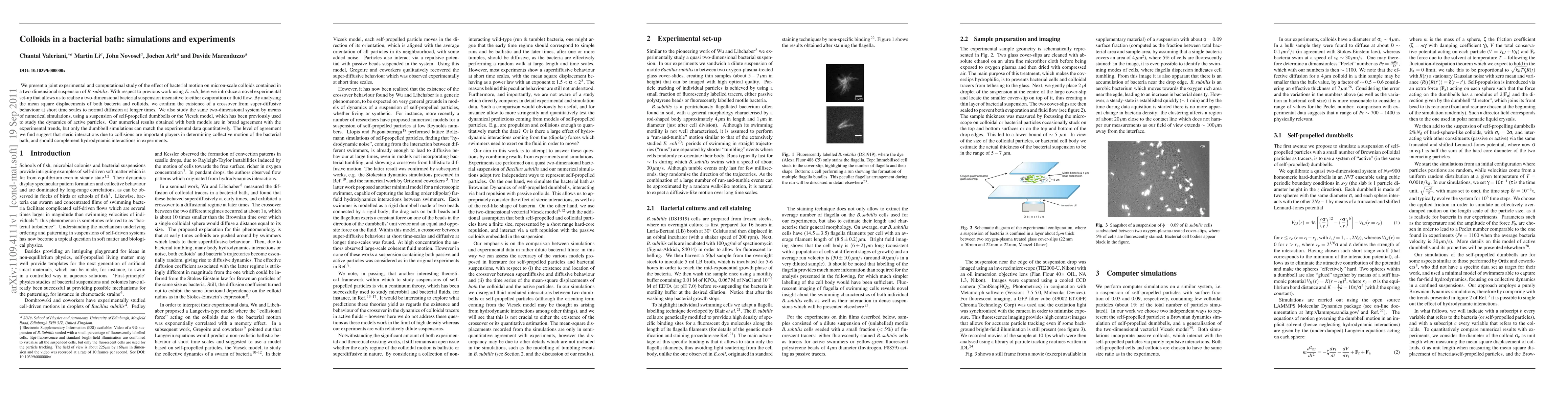 This paper combines experimental and computational studies to investigate how Bacillus subtilis bacteria affect the motion of micron-scale colloids in a two-dimensional suspension. The study finds a transition from super-diffusive to normal diffusion in both bacteria and colloids, with simulations using self-propelled dumbbells providing the best quantitative match to experimental data, highlighting the importance of steric interactions.