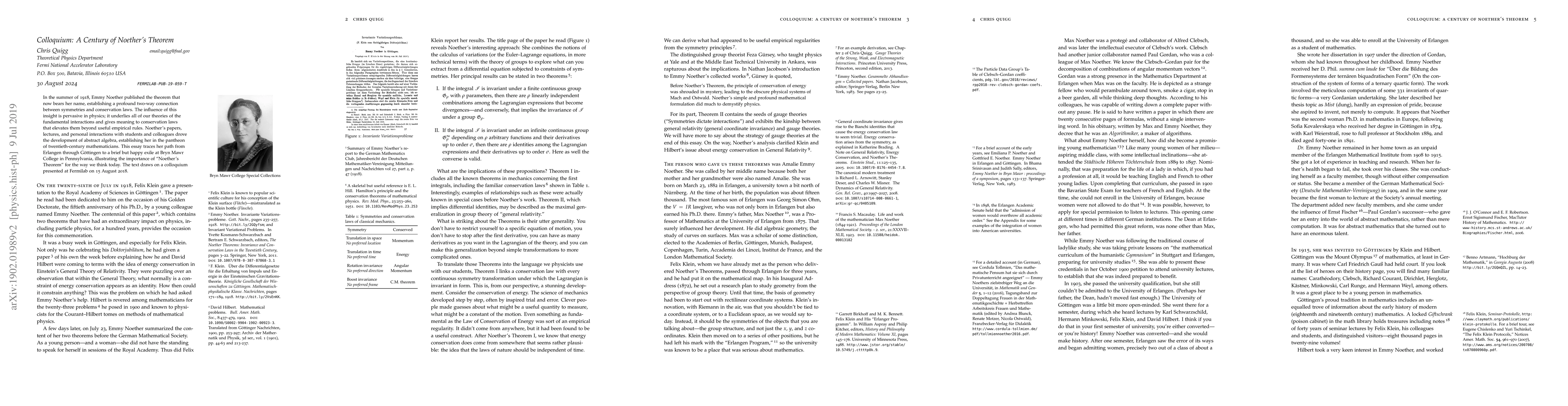 In the summer of 1918, Emmy Noether published the theorem that now bears her name, establishing a profound two-way connection between symmetries and conservation laws. The influence of this insight is pervasive in physics; it underlies all of our theories of the fundamental interactions and gives meaning to conservation laws that elevates them beyond useful empirical rules. Noether's papers, lectures, and personal interactions with students and colleagues drove the development of abstract algebra, establishing her in the pantheon of twentieth-century mathematicians. This essay traces her path from Erlangen through G\"ottingen to a brief but happy exile at Bryn Mawr College in Pennsylvania, illustrating the importance of "Noether's Theorem" for the way we think today. The text draws on a colloquium presented at Fermilab on 15 August 2018.