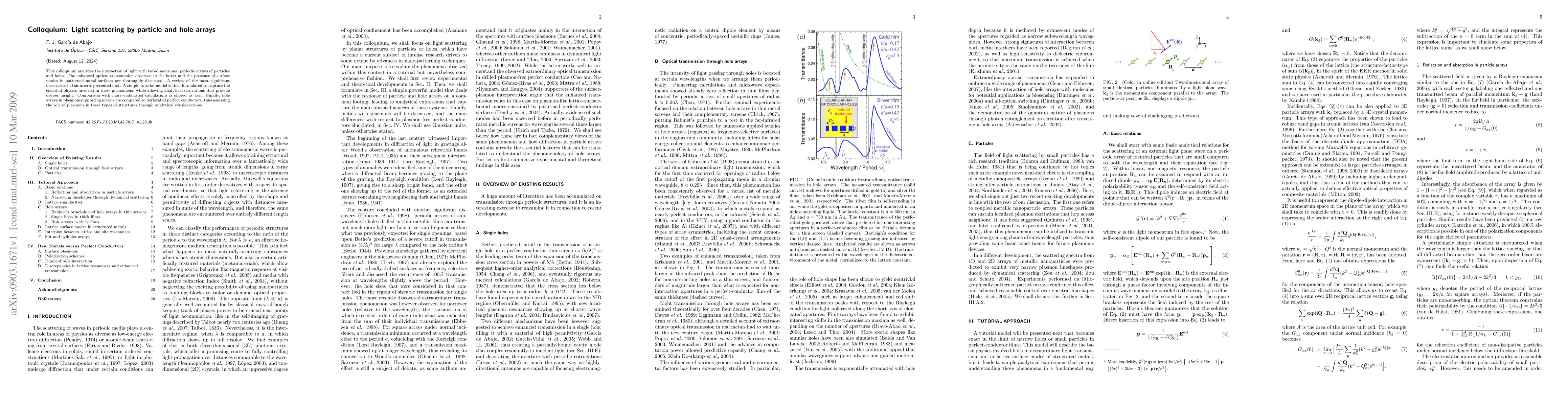 This colloquium analyzes the interaction of light with two-dimensional periodic arrays of particles and holes. The enhanced optical transmission observed in the latter and the presence of surface modes in patterned metal surfaces are thoroughly discussed. A review of the most significant discoveries in this area is presented first. A simple tutorial model is then formulated to capture the essential physics involved in these phenomena, while allowing analytical derivations that provide deeper insight. Comparison with more elaborated calculations is offered as well. Finally, hole arrays in plasmon-supporting metals are compared to perforated perfect conductors, thus assessing the role of plasmons in these types of structures through analytical considerations.