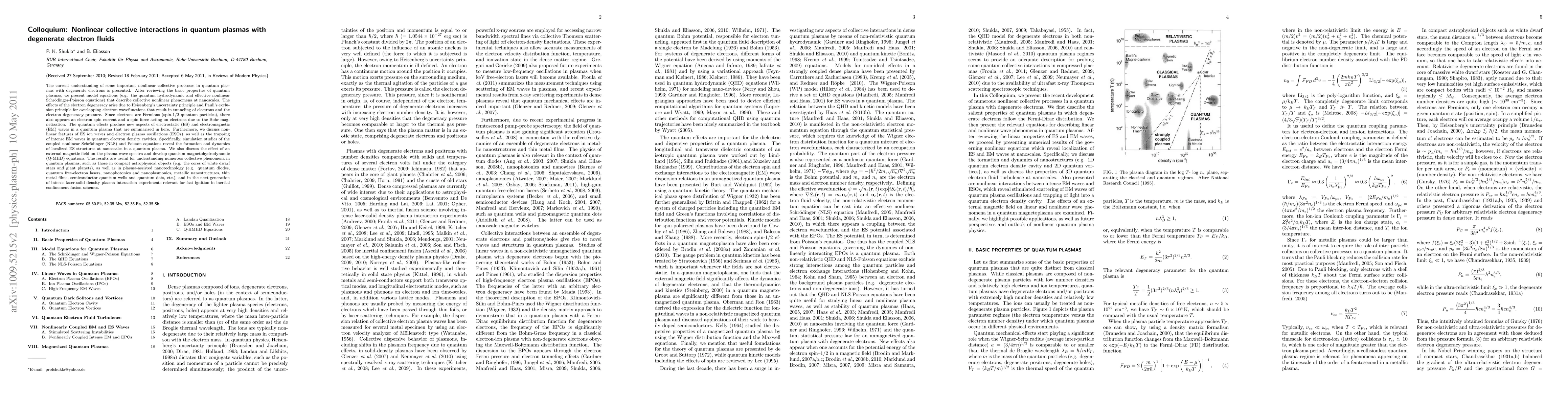 This research paper discusses nonlinear collective interactions in quantum plasmas with degenerate electron fluids, employing quantum hydrodynamic and effective nonlinear Schrödinger-Poisson equations to model these phenomena. It highlights the impact of quantum effects and electron degeneracy on electrostatic and electromagnetic wave behaviors, including the formation of localized structures and the influence of external magnetic fields, relevant for astrophysics and nanotechnology.