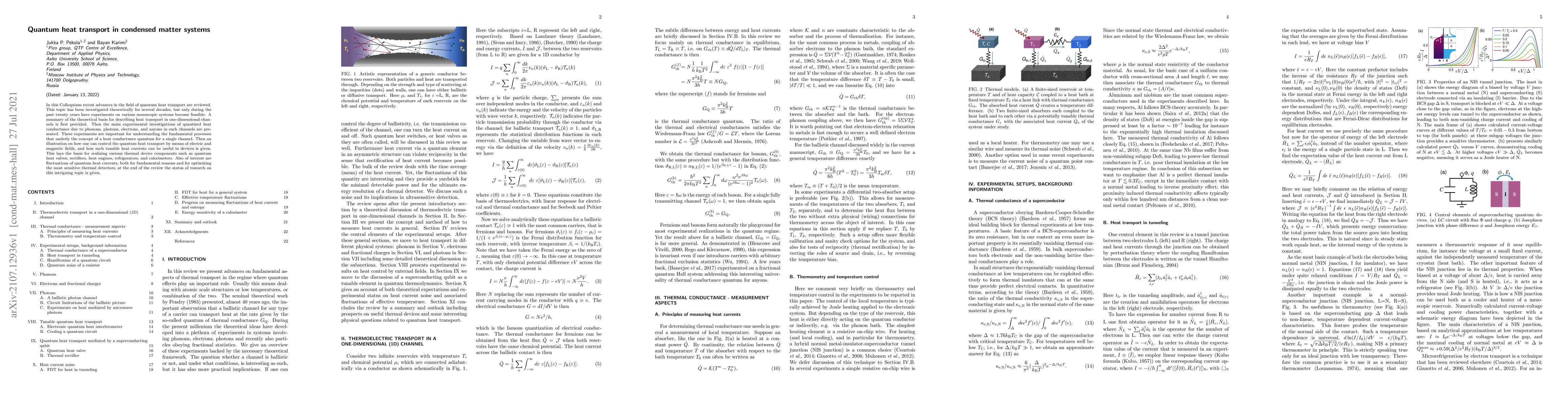 In this Colloquium recent advances in the field of quantum heat transport are reviewed. This topic has been investigated theoretically for several decades, but only during the past twenty years have experiments on various mesoscopic systems become feasible. A summary of the theoretical basis for describing heat transport in one-dimensional channels is first provided. Then the main experimental investigations of quantized heat conductance due to phonons, photons, electrons, and anyons in such channels are presented. These experiments are important for understanding the fundamental processes that underly the concept of a heat conductance quantum for a single channel. Then an illustration on how one can control the quantum heat transport by means of electric and magnetic fields, and how such tunable heat currents can be useful in devices is given. This lays the basis for realizing various thermal device components such as quantum heat valves, rectifiers, heat engines, refrigerators, and calorimeters. Also of interest are fluctuations of quantum heat currents, both for fundamental reasons and for optimizing the most sensitive thermal detectors; at the end of the review the status of research on this intriguing topic is given.