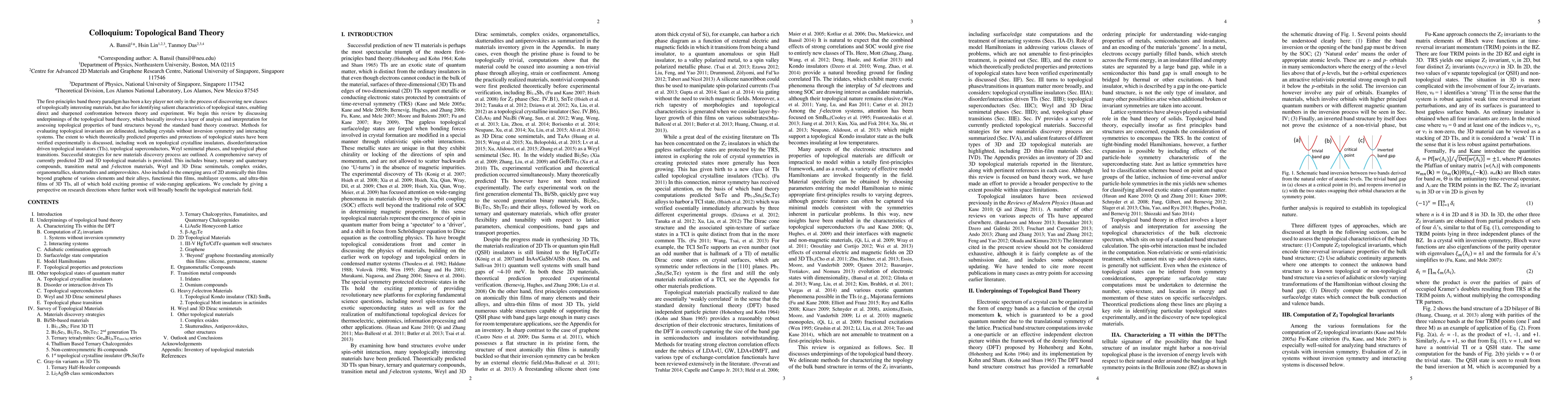 The first-principles band theory paradigm has been a key player not only in the process of discovering new classes of topologically interesting materials, but also for identifying salient characteristics of topological states, enabling direct and sharpened confrontation between theory and experiment. We begin this review by discussing underpinnings of the topological band theory, which basically involves a layer of analysis and interpretation for assessing topological properties of band structures beyond the standard band theory construct. Methods for evaluating topological invariants are delineated, including crystals without inversion symmetry and interacting systems. The extent to which theoretically predicted properties and protections of topological states have been verified experimentally is discussed, including work on topological crystalline insulators, disorder/interaction driven topological insulators (TIs), topological superconductors, Weyl semimetal phases, and topological phase transitions. Successful strategies for new materials discovery process are outlined. A comprehensive survey of currently predicted 2D and 3D topological materials is provided. This includes binary, ternary and quaternary compounds, transition metal and f-electron materials, Weyl and 3D Dirac semimetals, complex oxides, organometallics, skutterudites and antiperovskites. Also included is the emerging area of 2D atomically thin films beyond graphene of various elements and their alloys, functional thin films, multilayer systems, and ultra-thin films of 3D TIs, all of which hold exciting promise of wide-ranging applications. We conclude by giving a perspective on research directions where further work will broadly benefit the topological materials field.